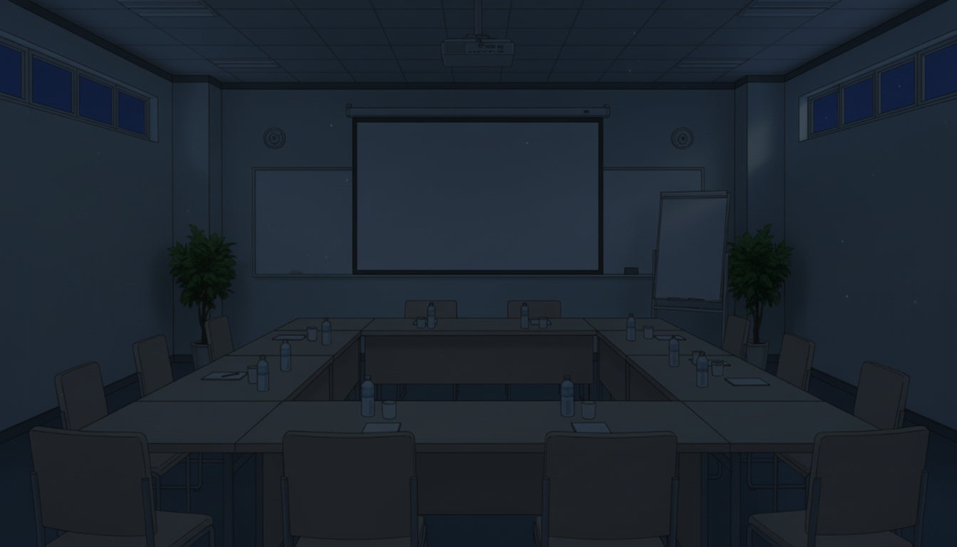日が沈んだ後の静けさが漂う、夜間ミーティングや準備シーンに合う背景です。