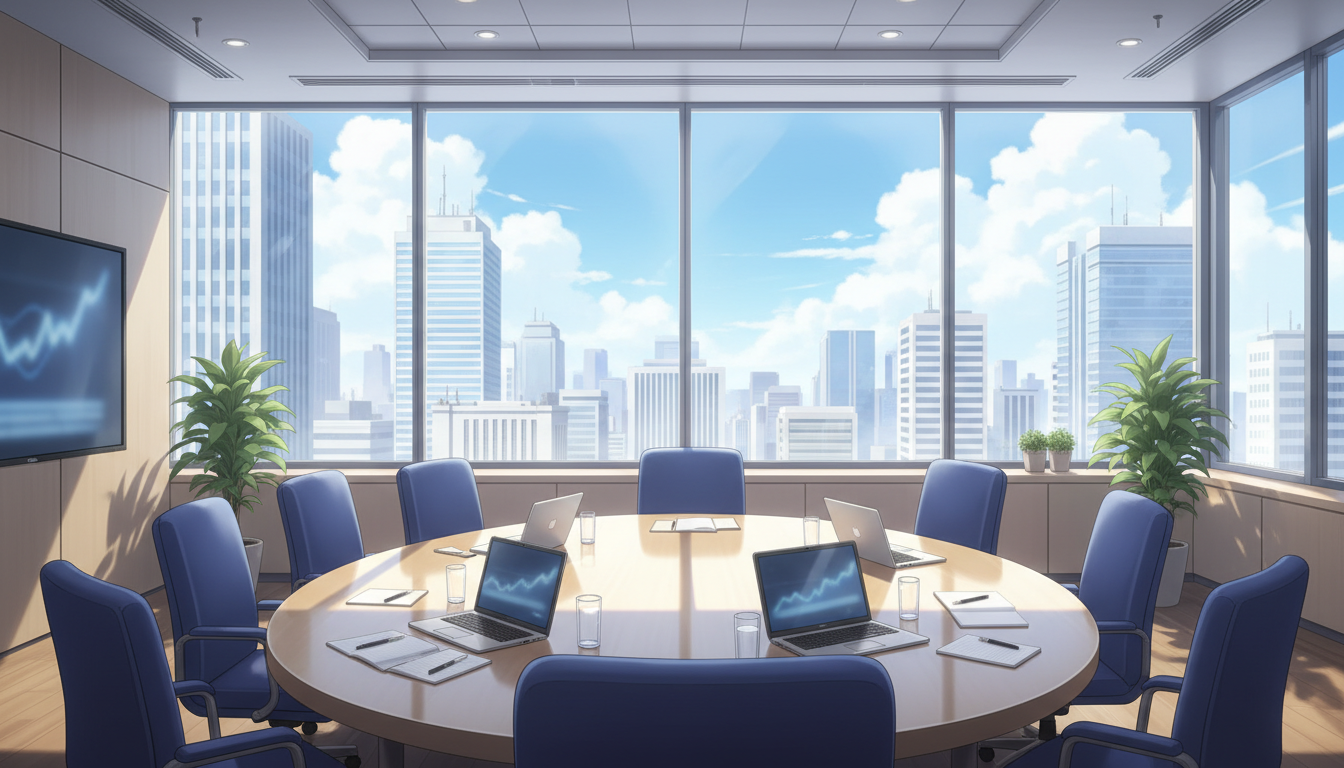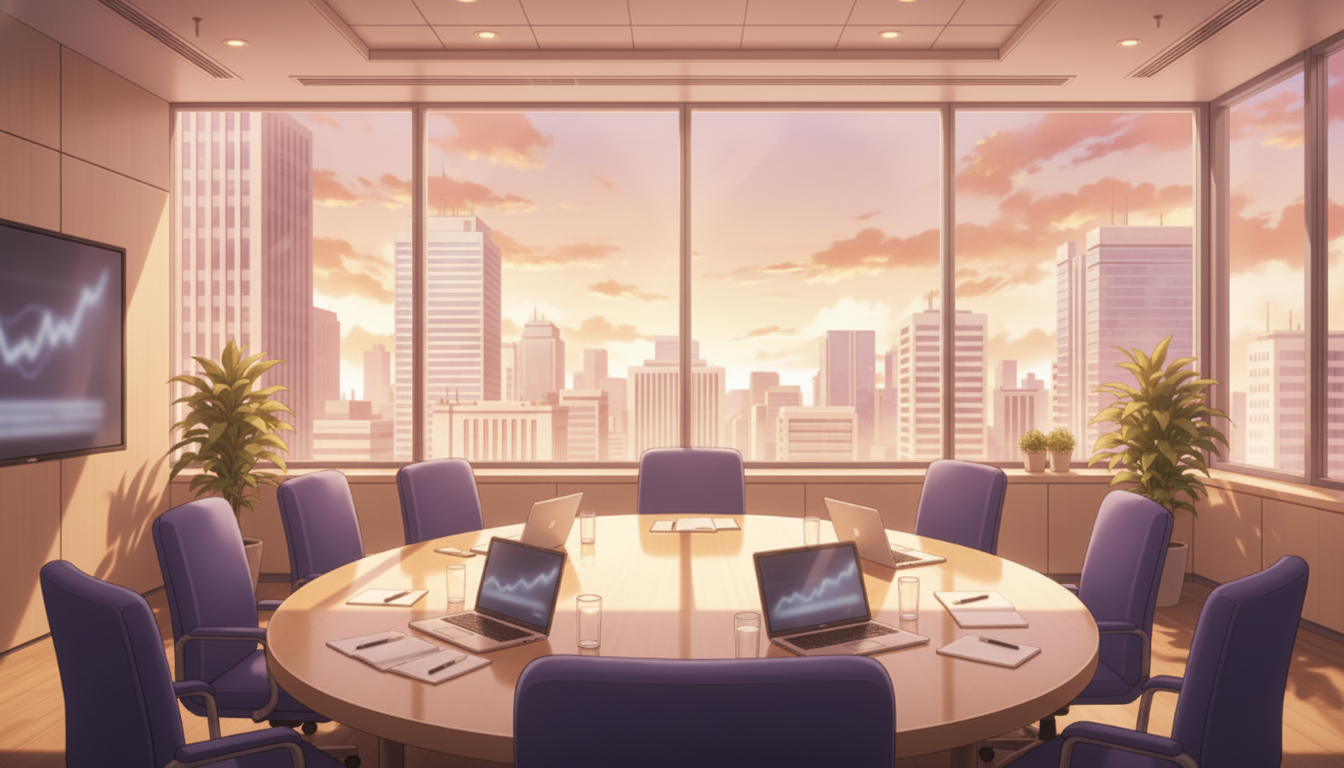 柔らかな朝日が差し込む清々しい会議室で、落ち着いた打ち合わせシーンに向いています。