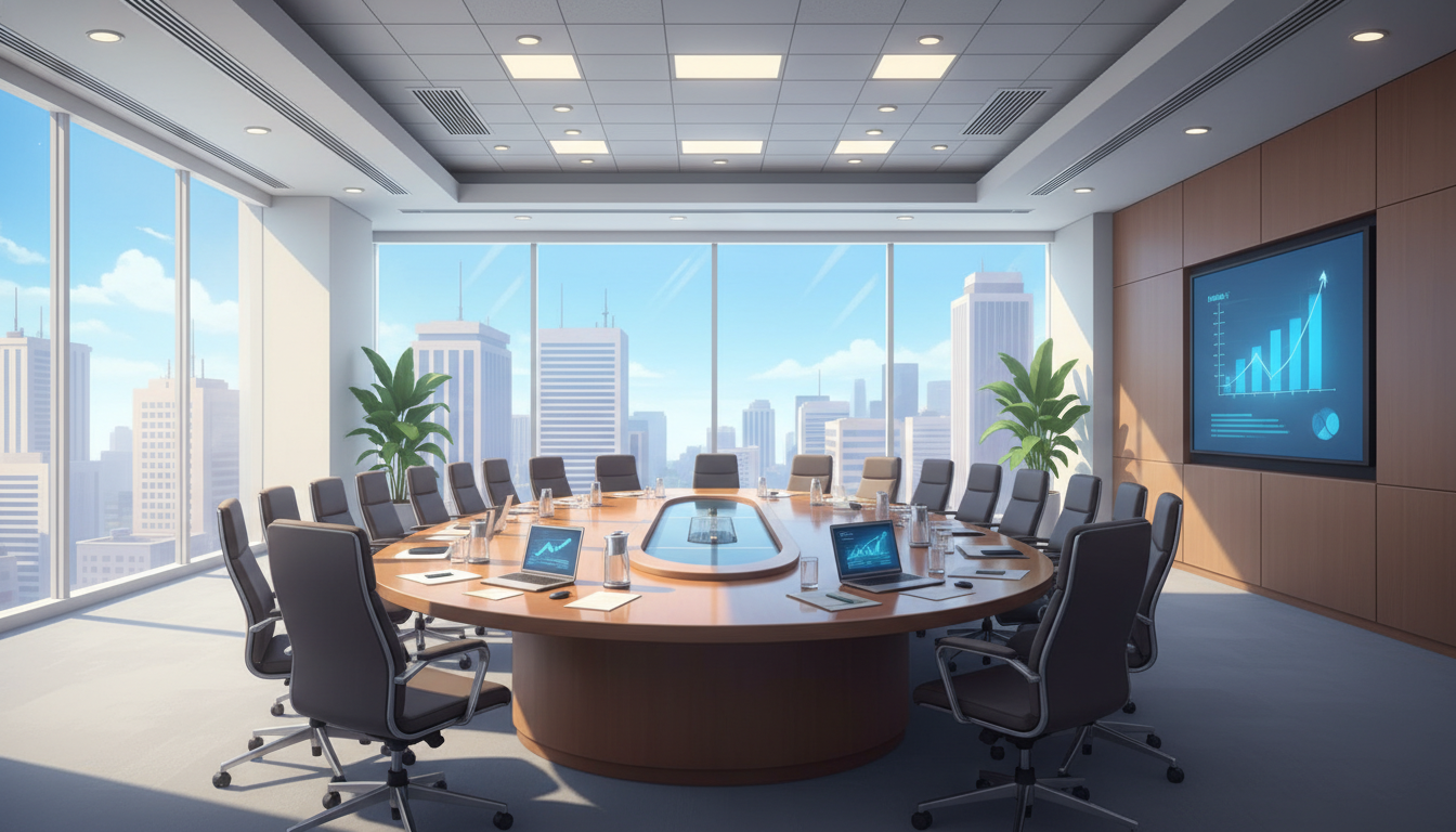 明るい日差しが差し込む重厚感ある会議室で、ビジネスプレゼンや交渉シーンにぴったりです。