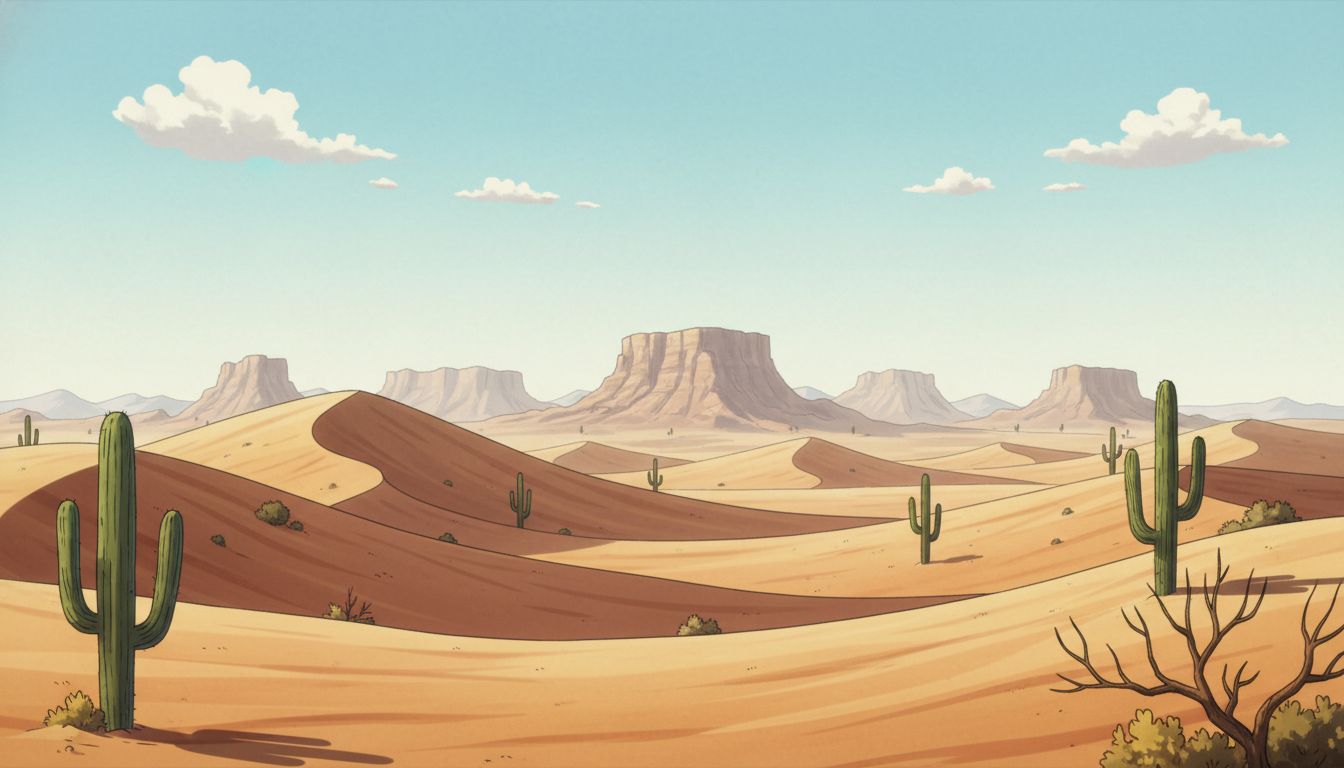広がる砂丘と遠景の台地、点在するサボテンを描いた王道の砂漠背景素材です。