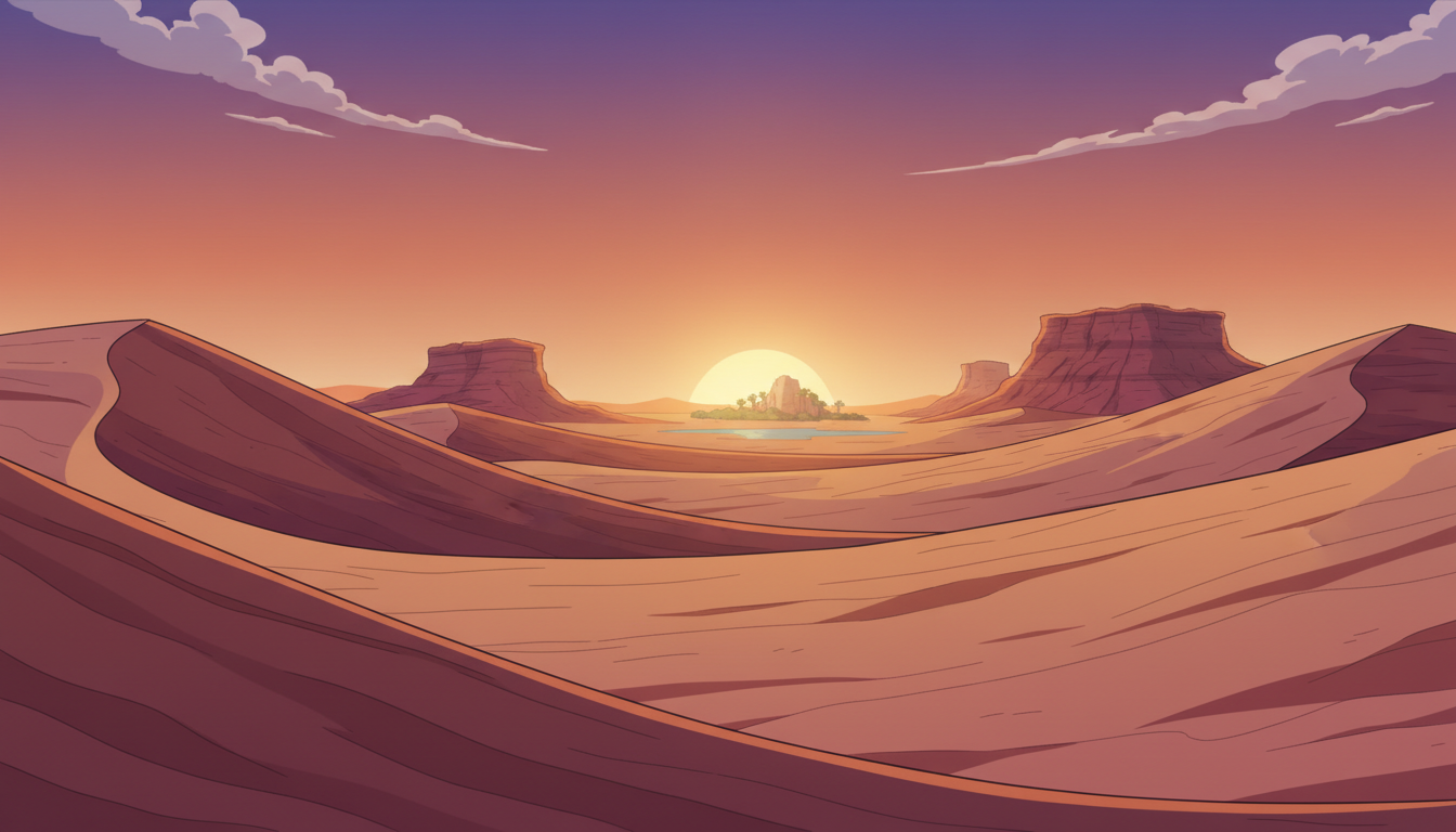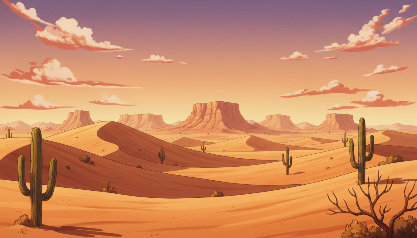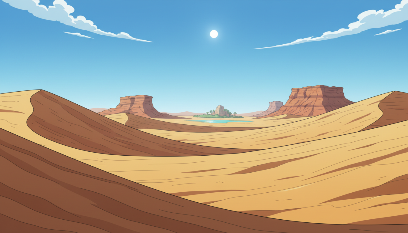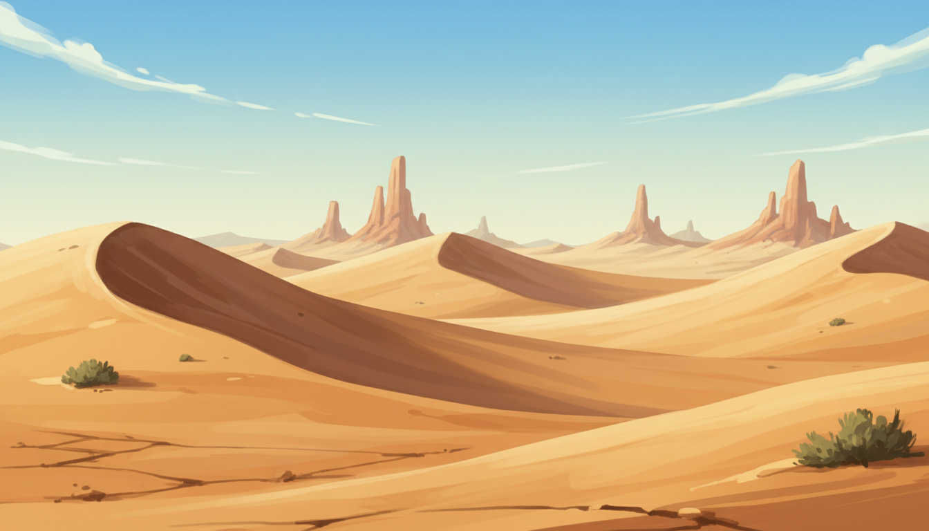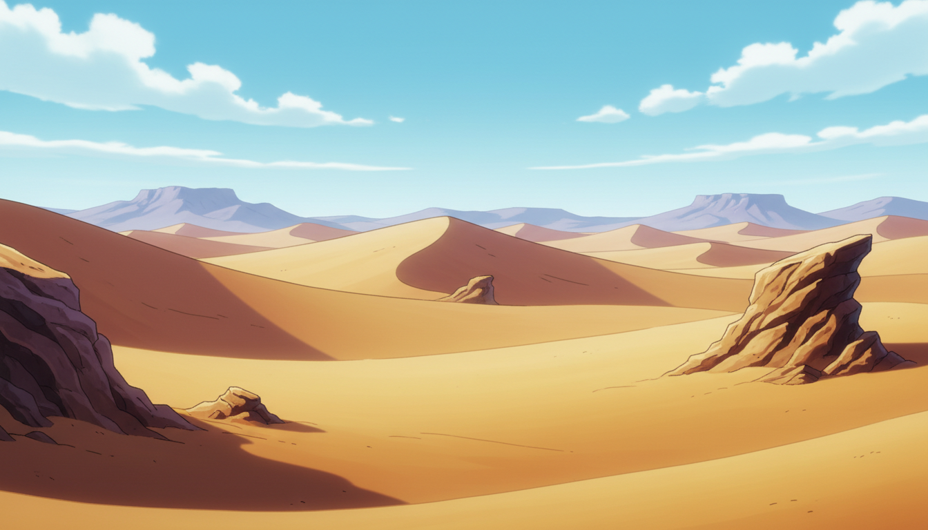 砂漠の背景イラスト素材を無料配布。16:9の横長構図でPC向け作品に使いやすい背景イラストです。漫画・Webtoonやゲーム背景として商用・トレース利用もOK!