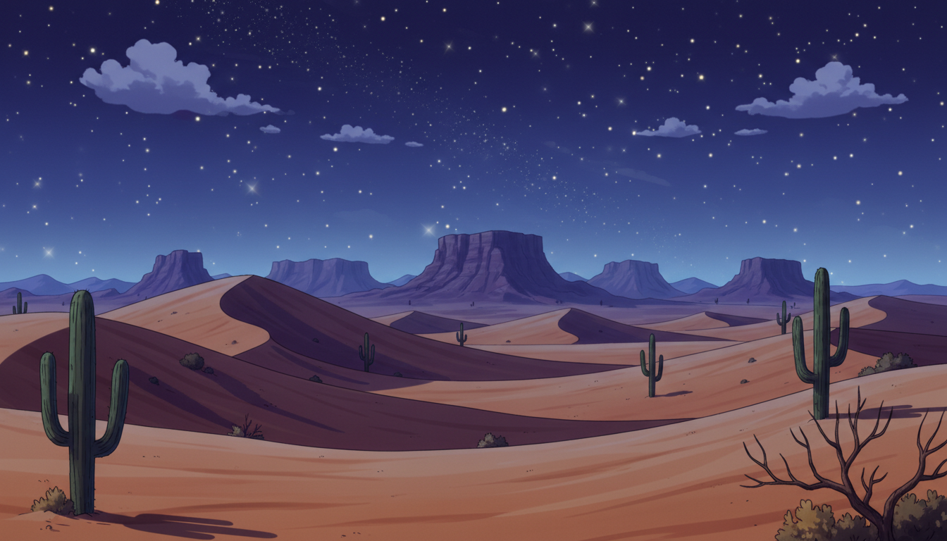 満天の星が輝く静かな砂漠を描いた、幻想的な夜景背景素材です。