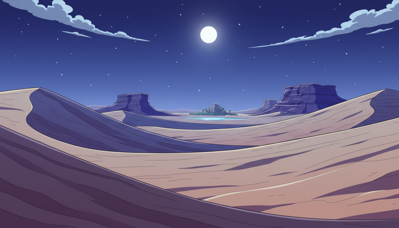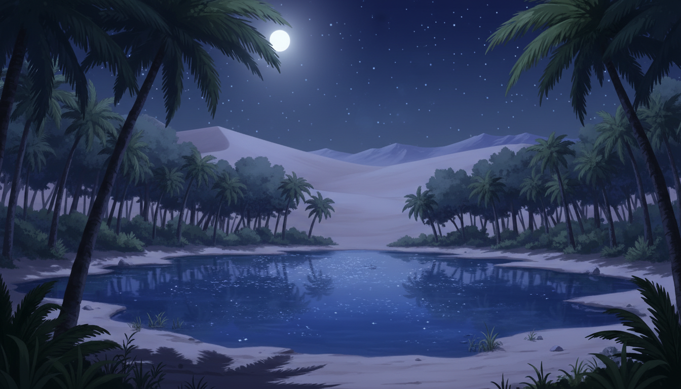 満月と星空に照らされた静寂のオアシスを描いた、幻想的な砂漠の夜景背景イラスト素材です。