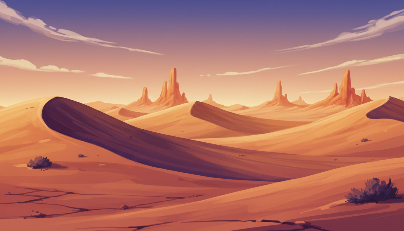 波打つ砂丘と特徴的な岩山を描いた、ファンタジーや西部劇風作品に使える背景素材です。