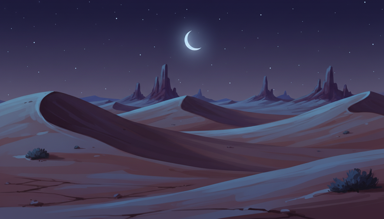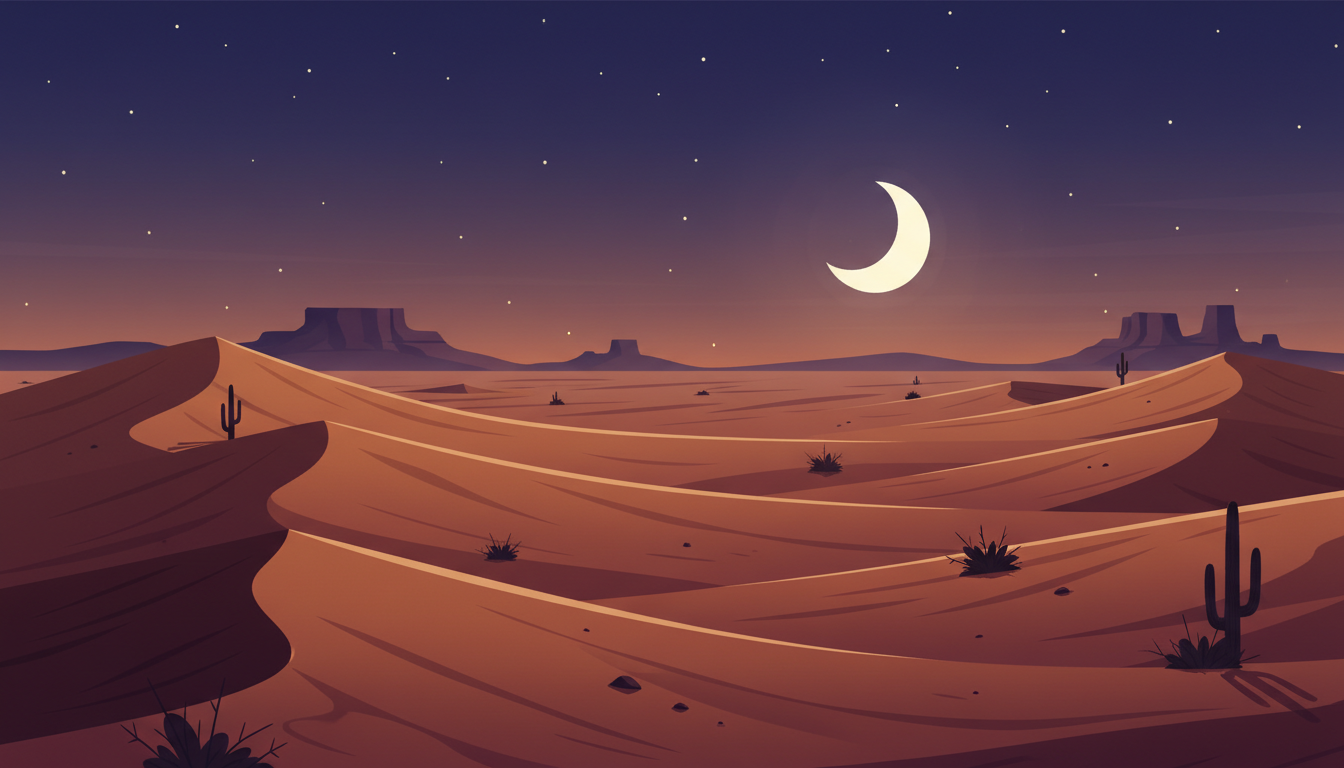 星が瞬く夜空と三日月の下に広がる静かな砂丘を描いた、神秘的な砂漠の背景イラスト素材です。