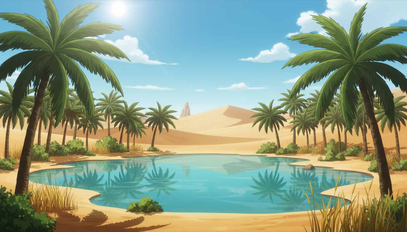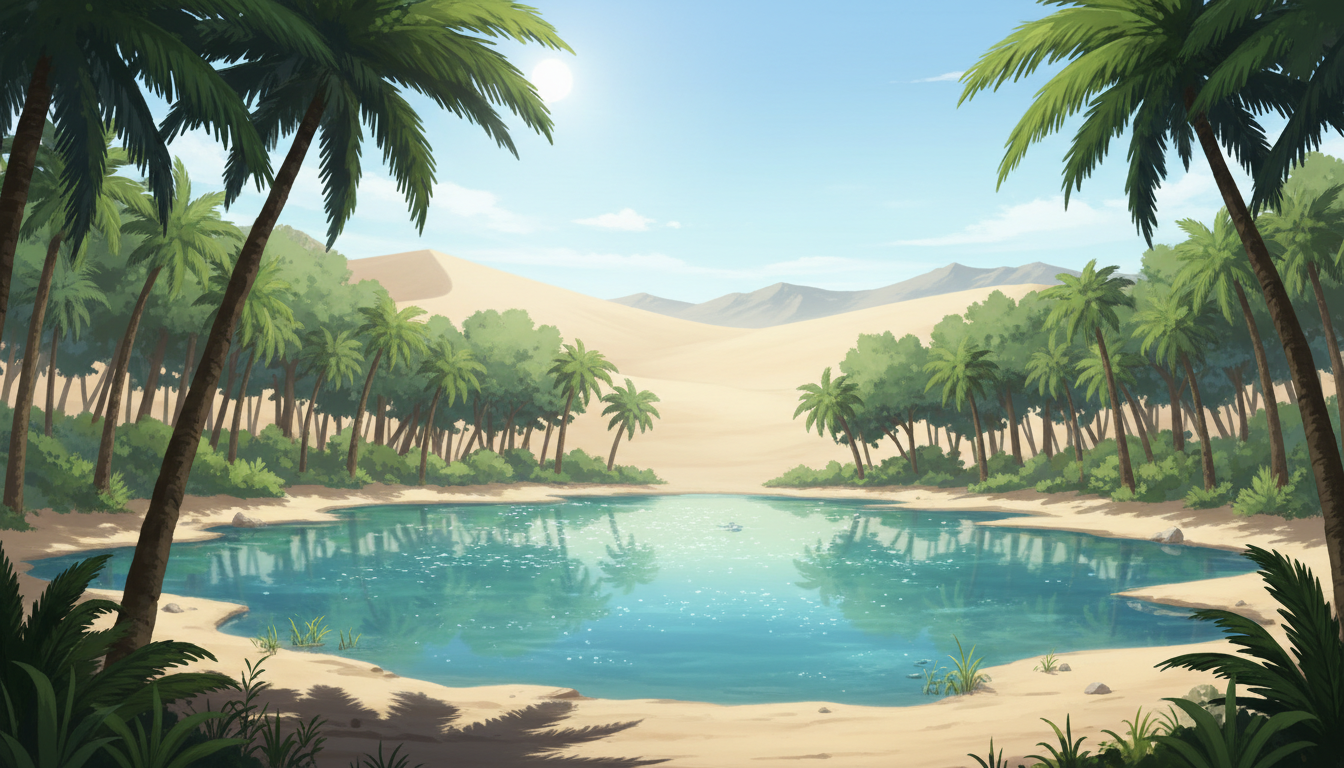青空の下で水面が輝くオアシスとヤシの木々を描いた、爽やかな砂漠の背景イラスト素材です。