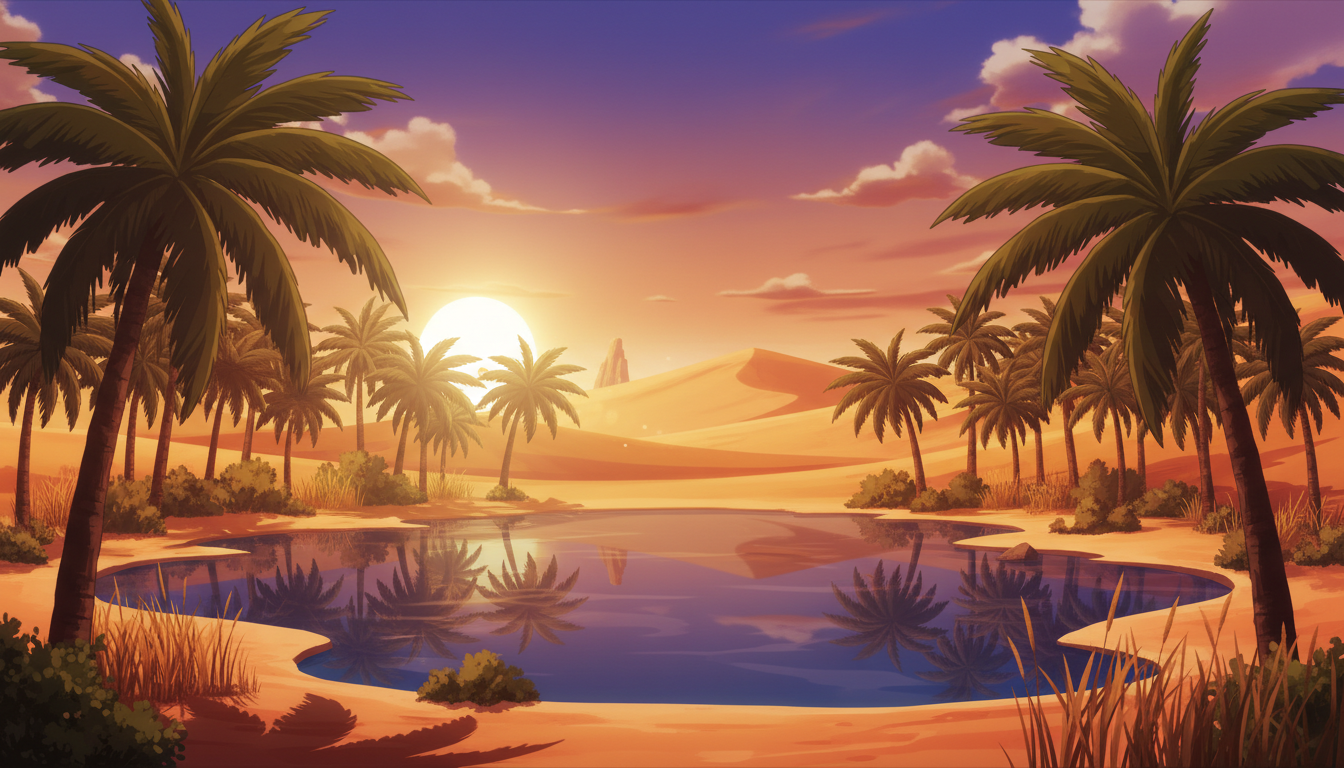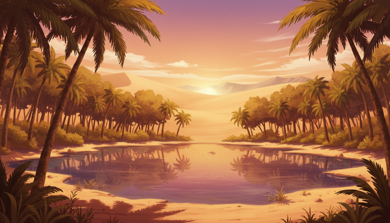 夕暮れのオアシスと黄金の砂丘|砂漠の背景イラスト素材