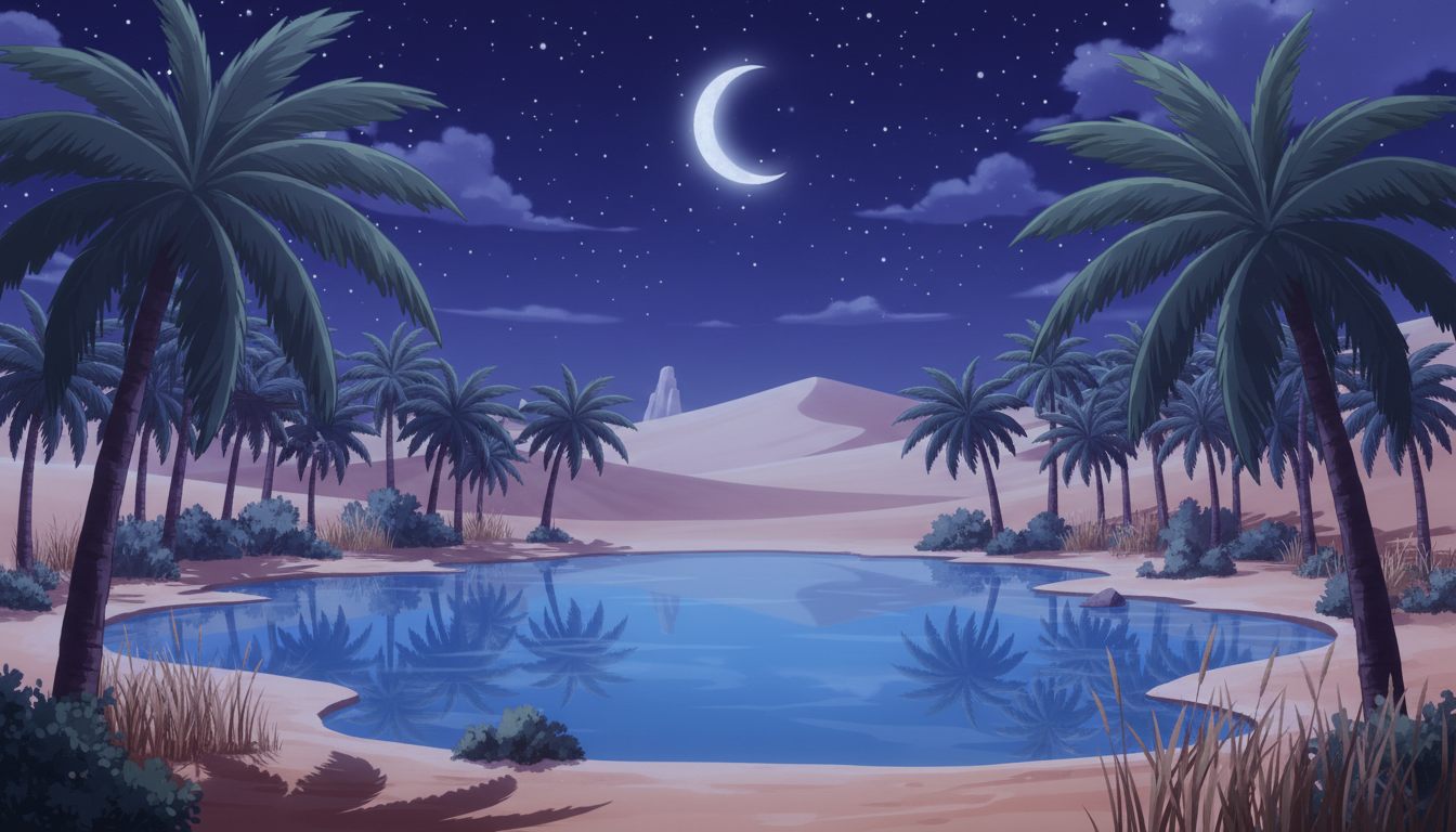 星が広がる夜空と三日月の光に包まれたオアシスを描いた、ファンタジー風の砂漠背景イラスト素材です。