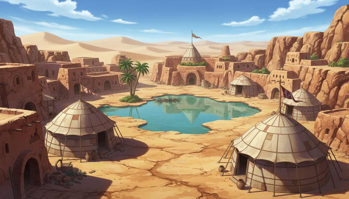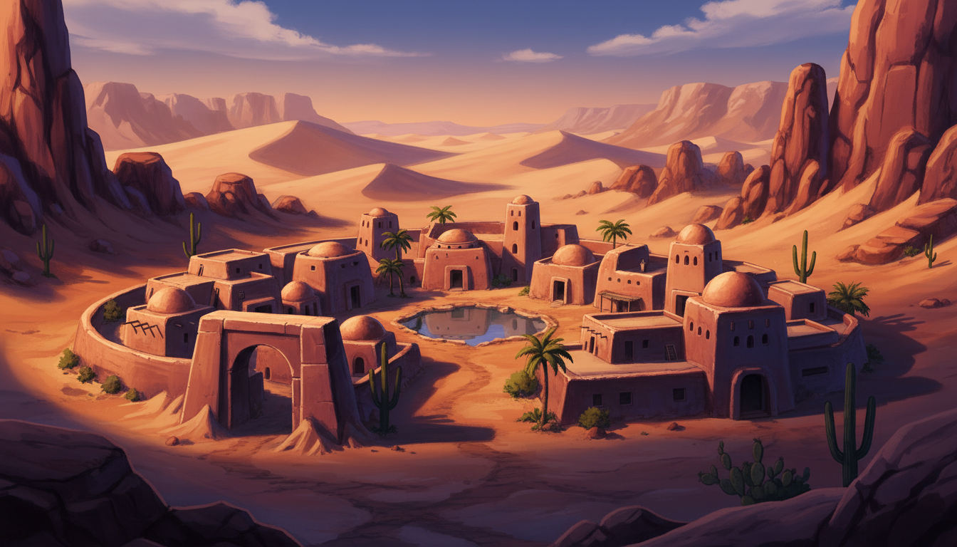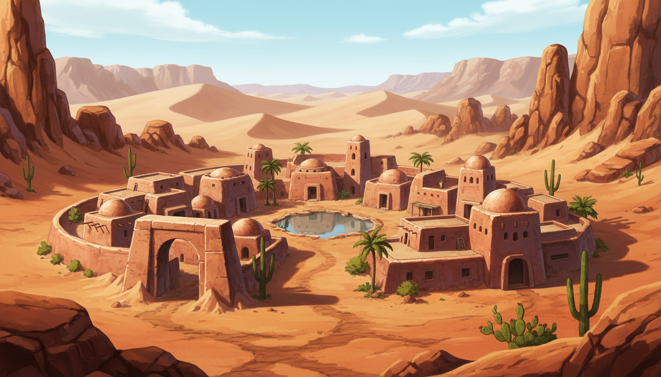 中央の井戸を囲む素朴な砂漠の集落を描いた、ゲームやアニメに使いやすい背景イラスト素材です。