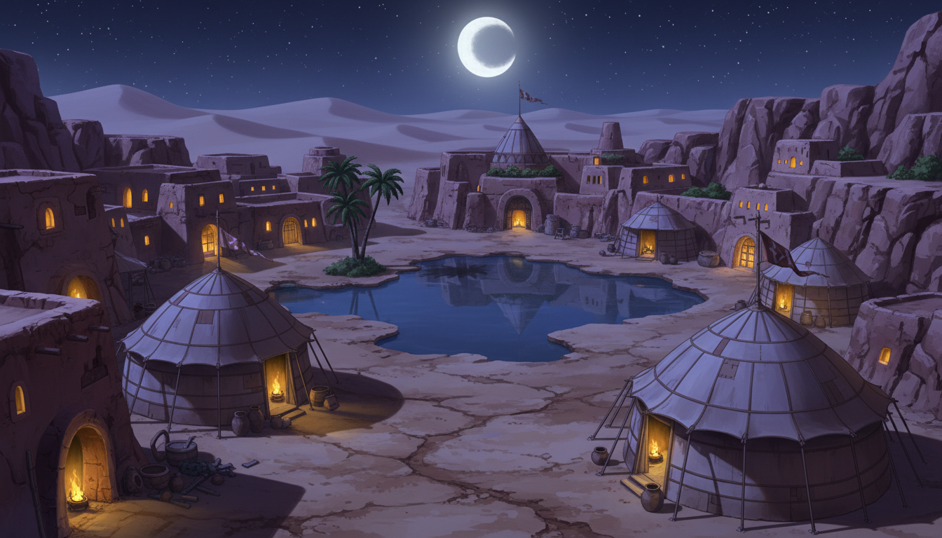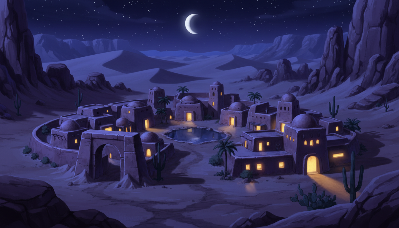 満月と星空に包まれた砂漠の村と湖を描いた、物語性のある夜景背景イラスト素材です。
