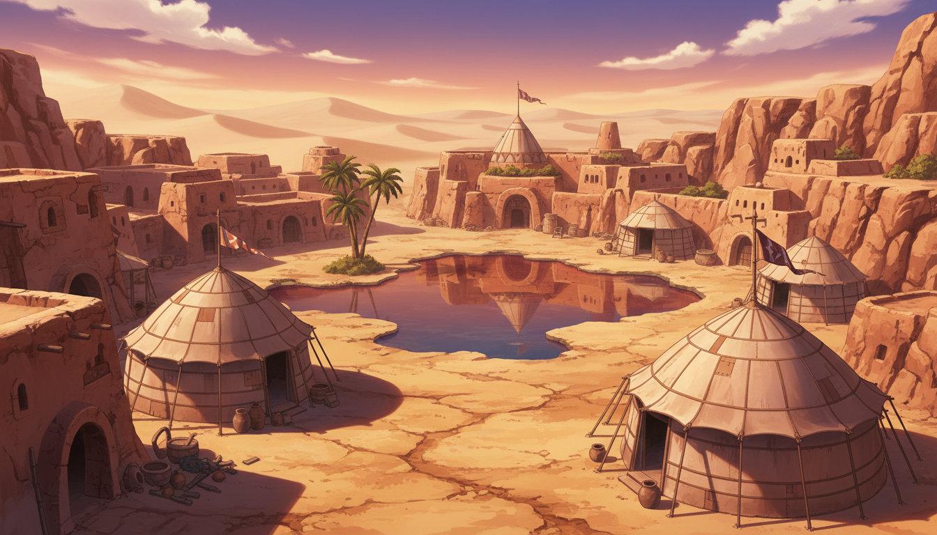 夕焼けに包まれた砂漠の集落と中央の水場を描いた、異国情緒あふれる背景イラスト素材です。