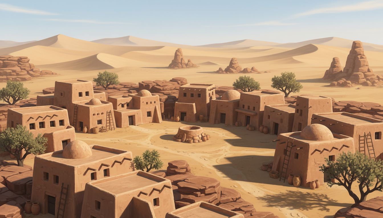 夕暮れの砂漠集落と井戸広場|夕方の砂漠背景イラスト素材
