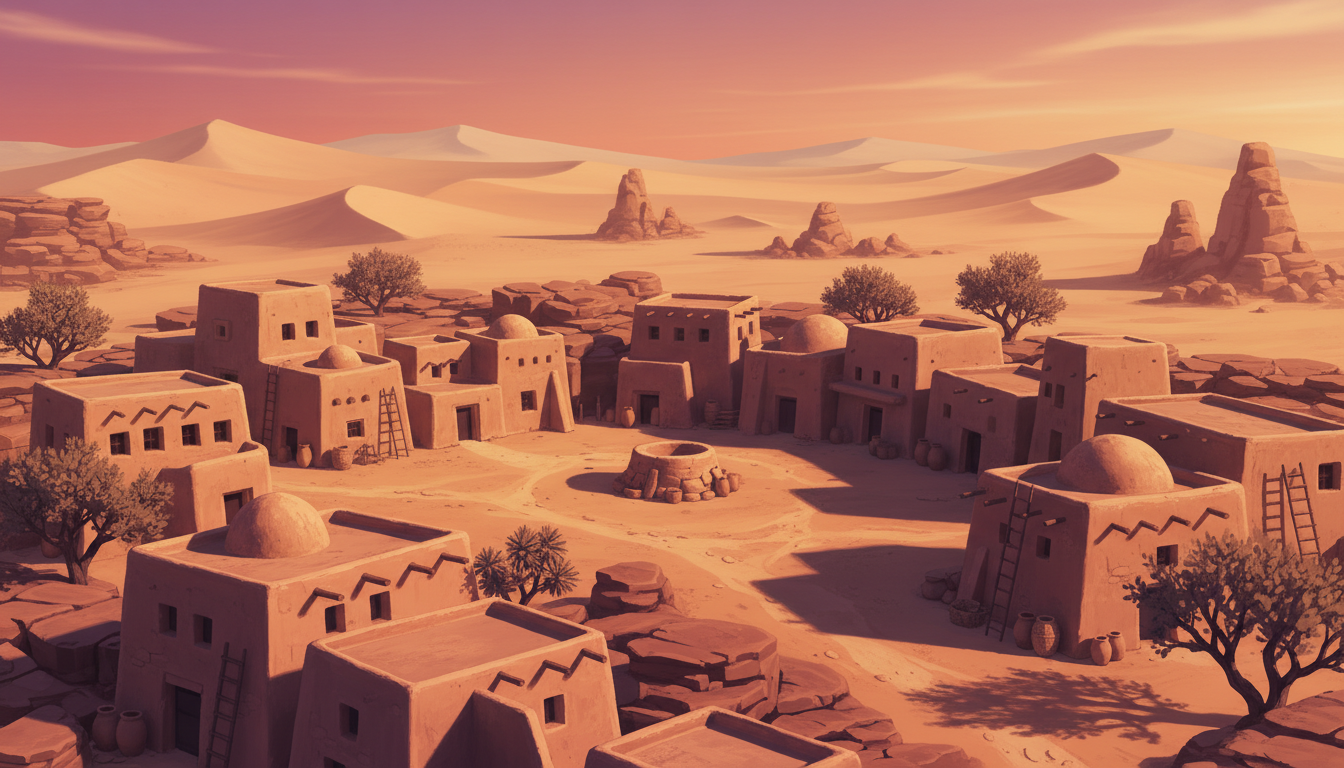 夕焼け空の下で静かに佇む砂漠の集落を描いた、ドラマチックな背景イラスト素材です。