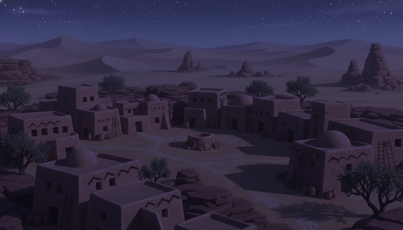 星空に包まれた砂漠の集落|夜の砂漠背景イラスト素材