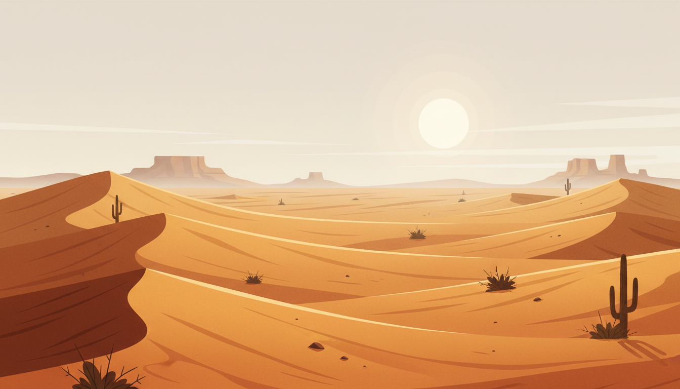 強い日差しの下に広がる砂丘とサボテンを描いた、シンプルで使いやすい砂漠背景イラスト素材です。