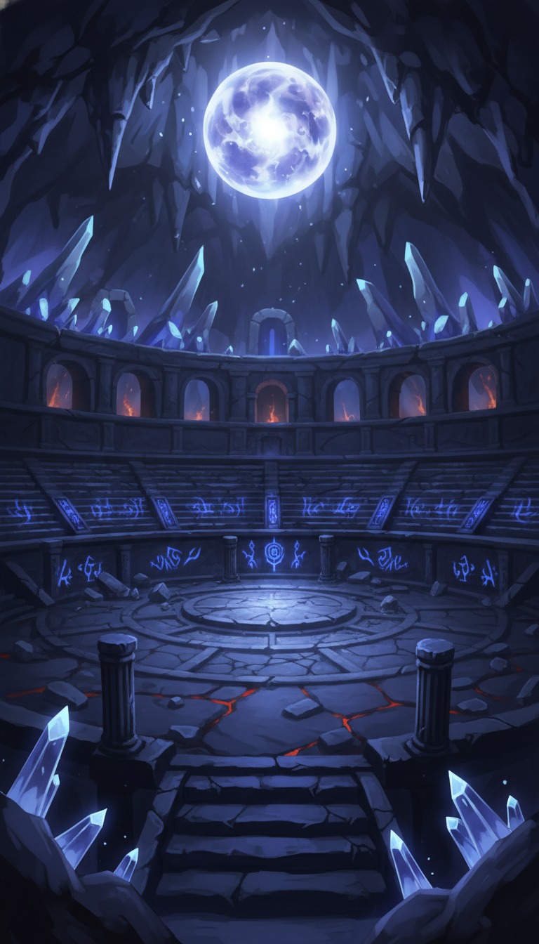 月輪の結晶闘技場|ルーン刻まれた地下円形アリーナ背景