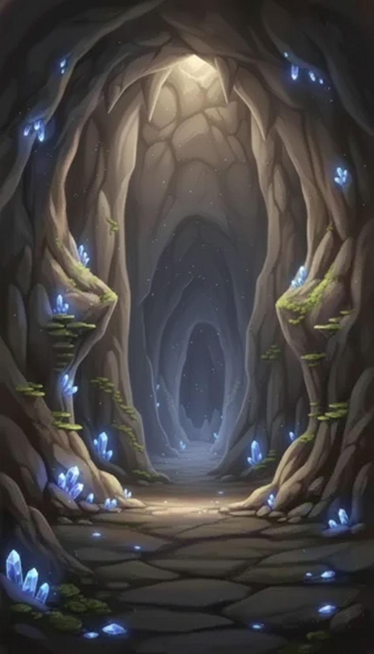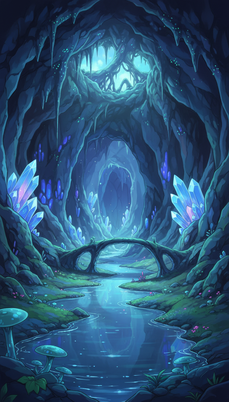 天井から光が差し込み、青結晶が輝く静謐な洞窟で、希望を象徴する場面に最適です。