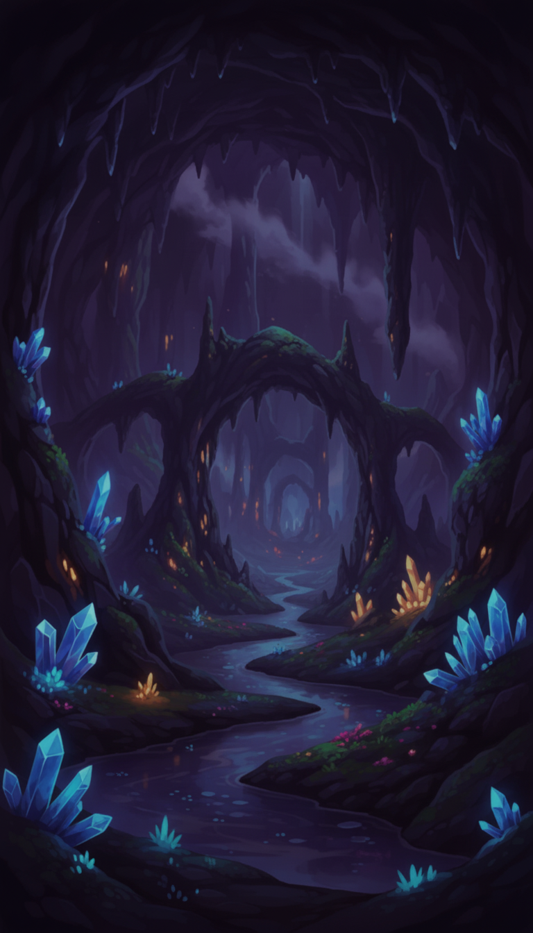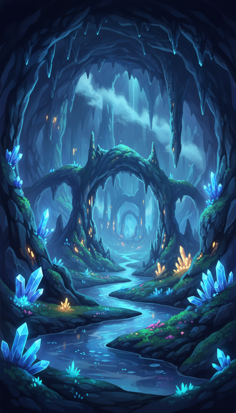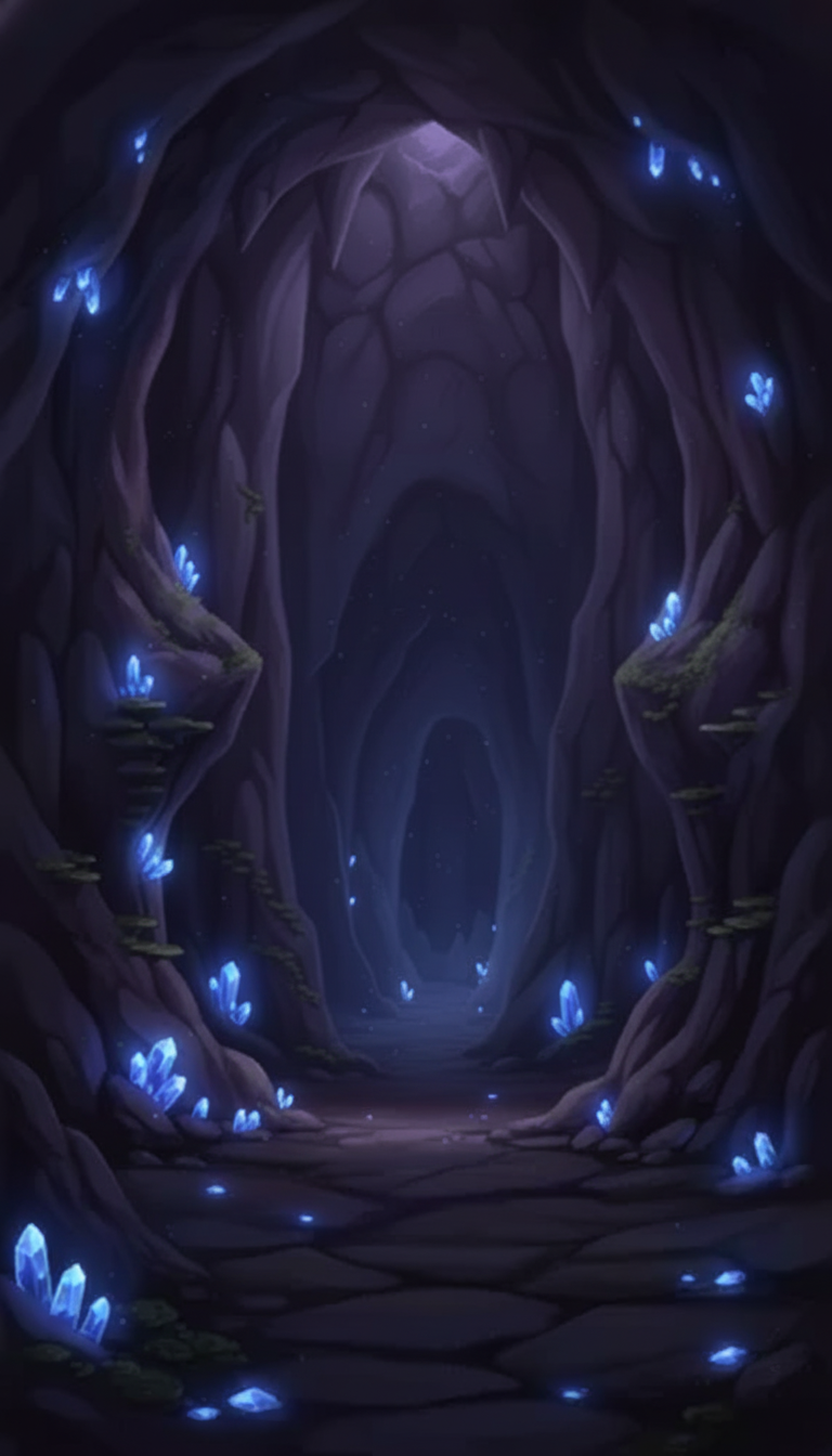 微かな光に照らされた結晶が幻想的に浮かび上がる、夜のダンジョン向け背景です。