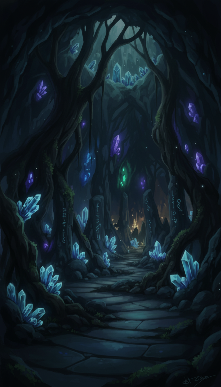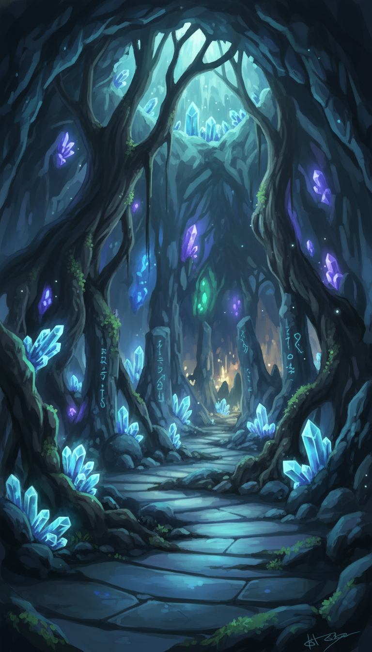 淡く光る結晶と刻まれた魔法文字が並ぶ、儀式場への通路を思わせる背景です。