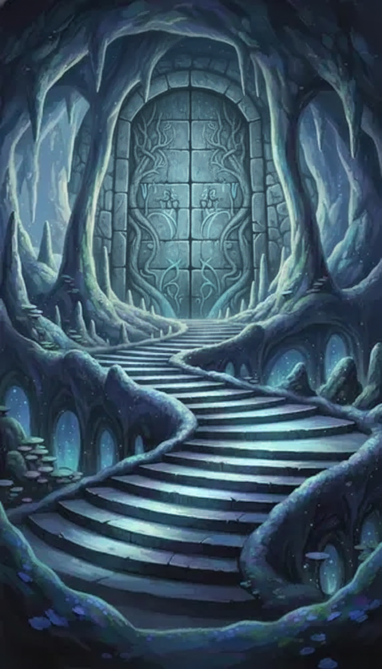 ファンタジーのダンジョンの背景イラスト素材を無料配布。9:16の縦長構図でスマホ作品に使いやすい背景イラストです。漫画・Webtoonやゲーム背景として商用・トレース利用もOK!