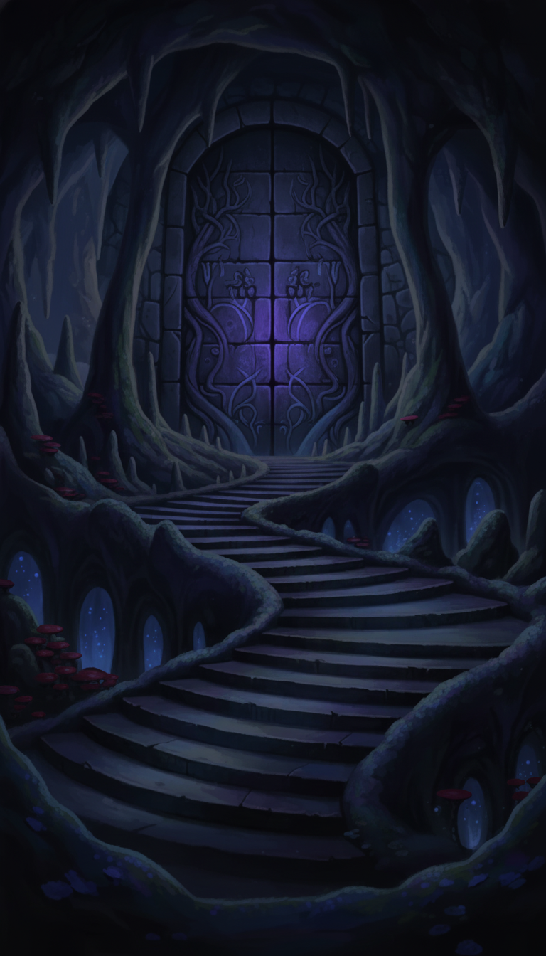 闇に包まれた階段と紫に光る封印の門が、不穏な力の存在を感じさせる背景です。