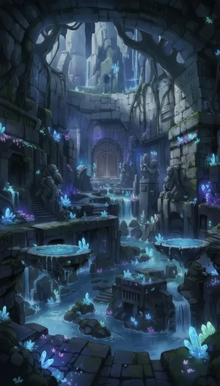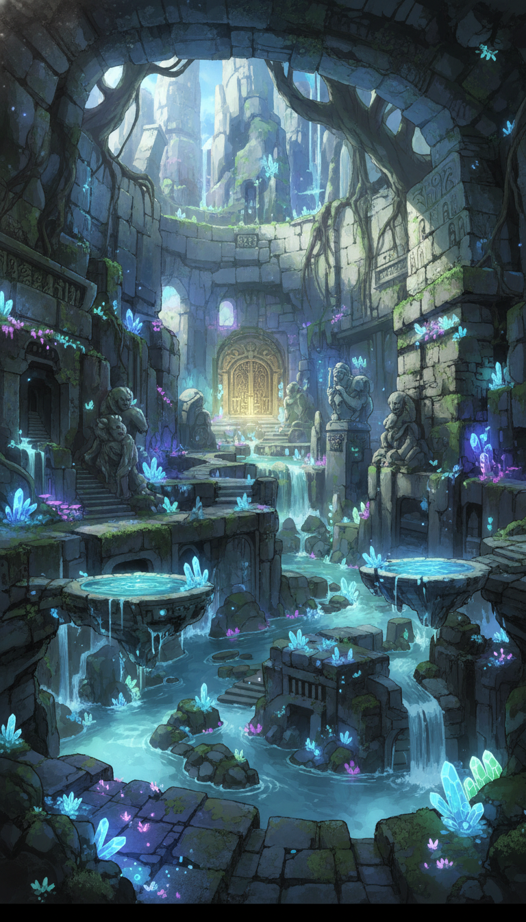 遺跡を巡る水路と小滝、淡く光る結晶が神秘性を高めるダンジョン背景です。