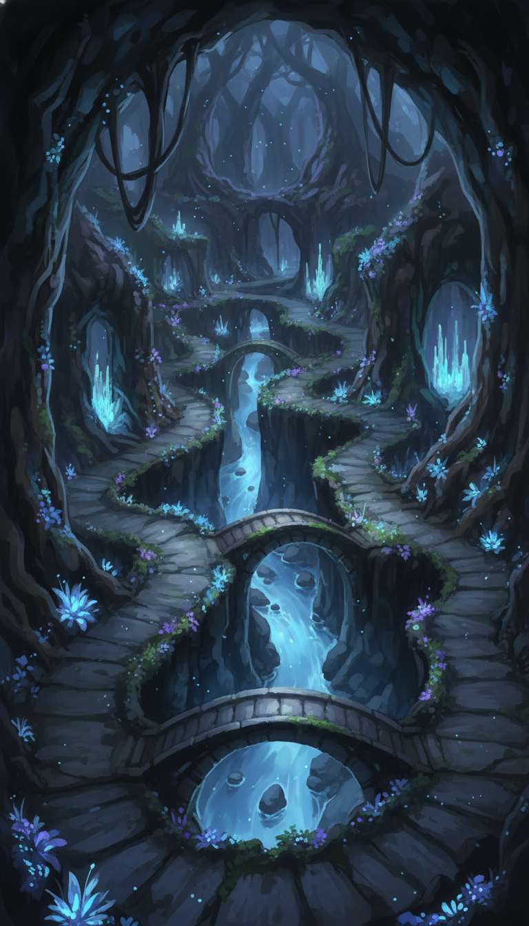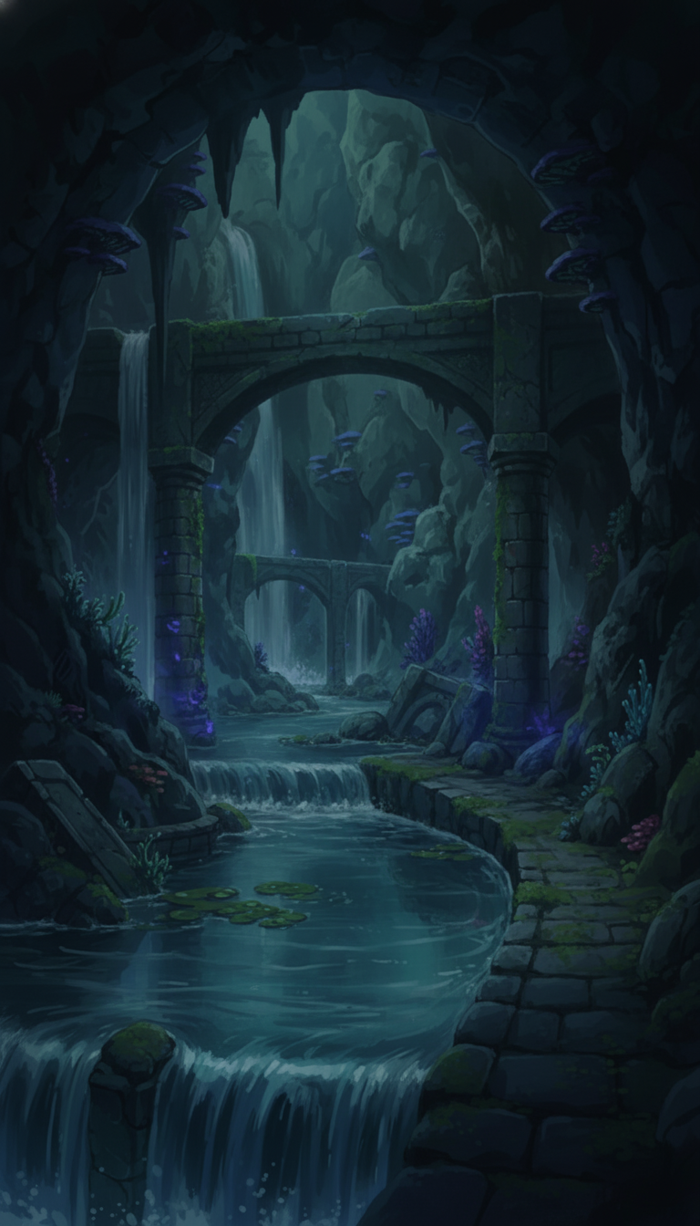 光量を抑えた水路と結晶の輝きが静けさを演出し、潜行や警戒シーンに向きます。