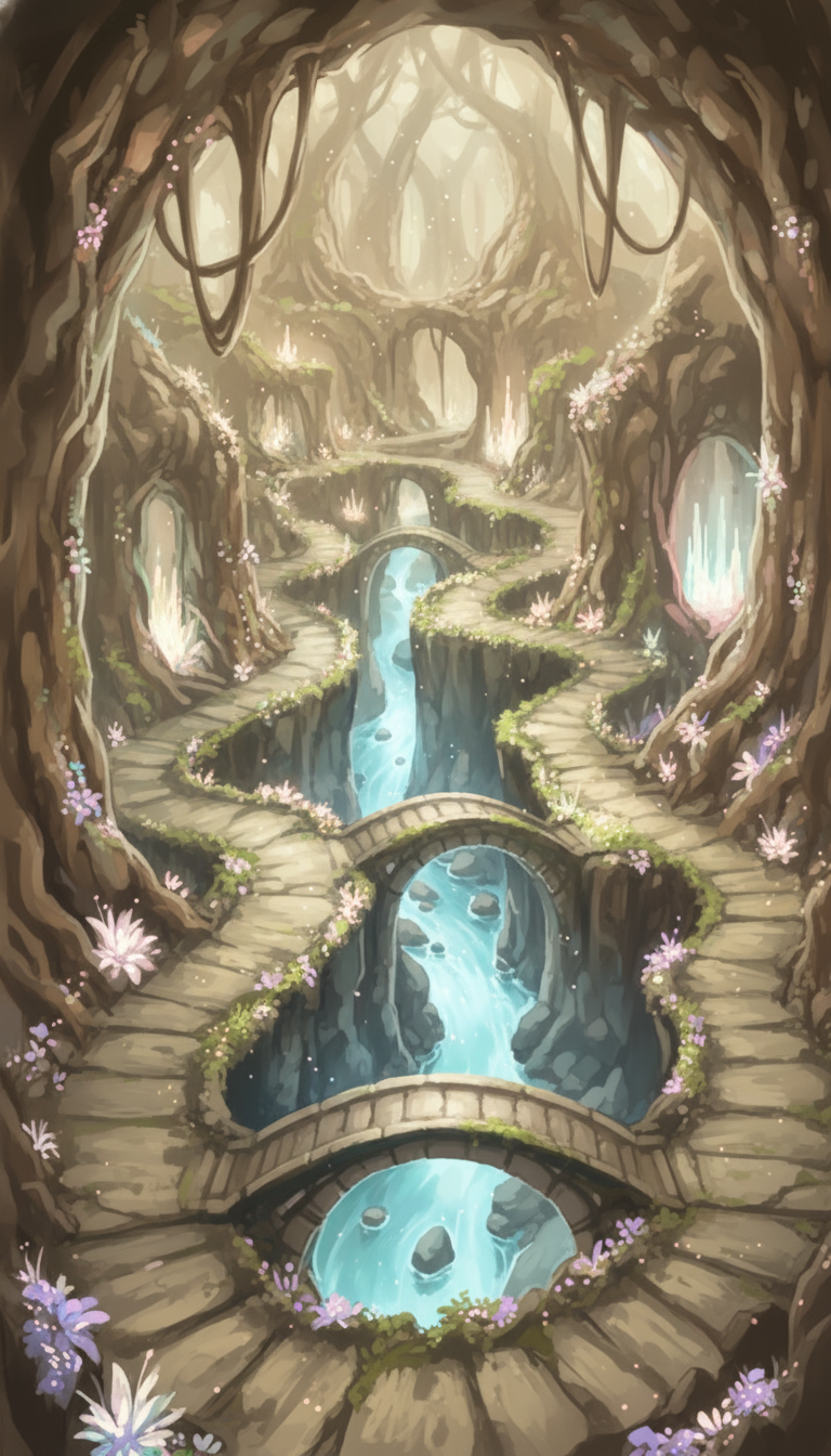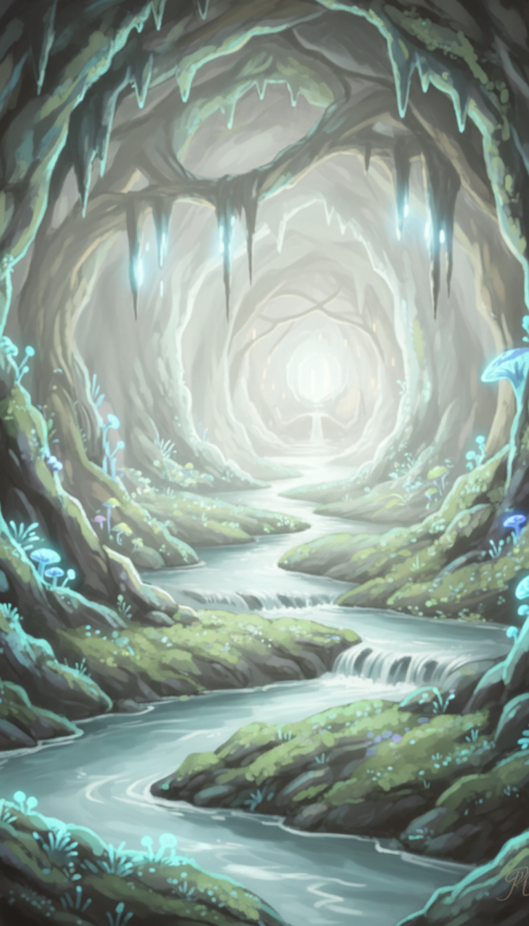 霧がかった明るい洞内に水の流れが続き、清浄な聖域や浄化イベントに合います。