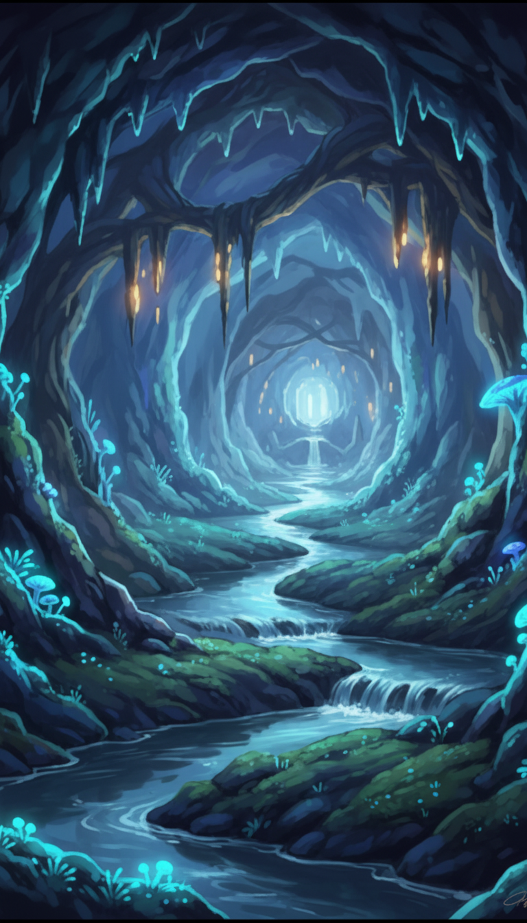 青白き地下渓流トンネル|発光キノコの洞窟