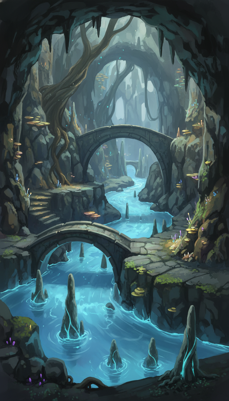 薄明かりの差し込む洞窟内に架かる石橋が印象的な、神秘的なダンジョンです。
