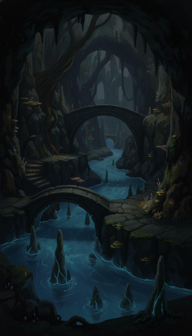 宵闇の石橋水路|静かな洞窟河川背景