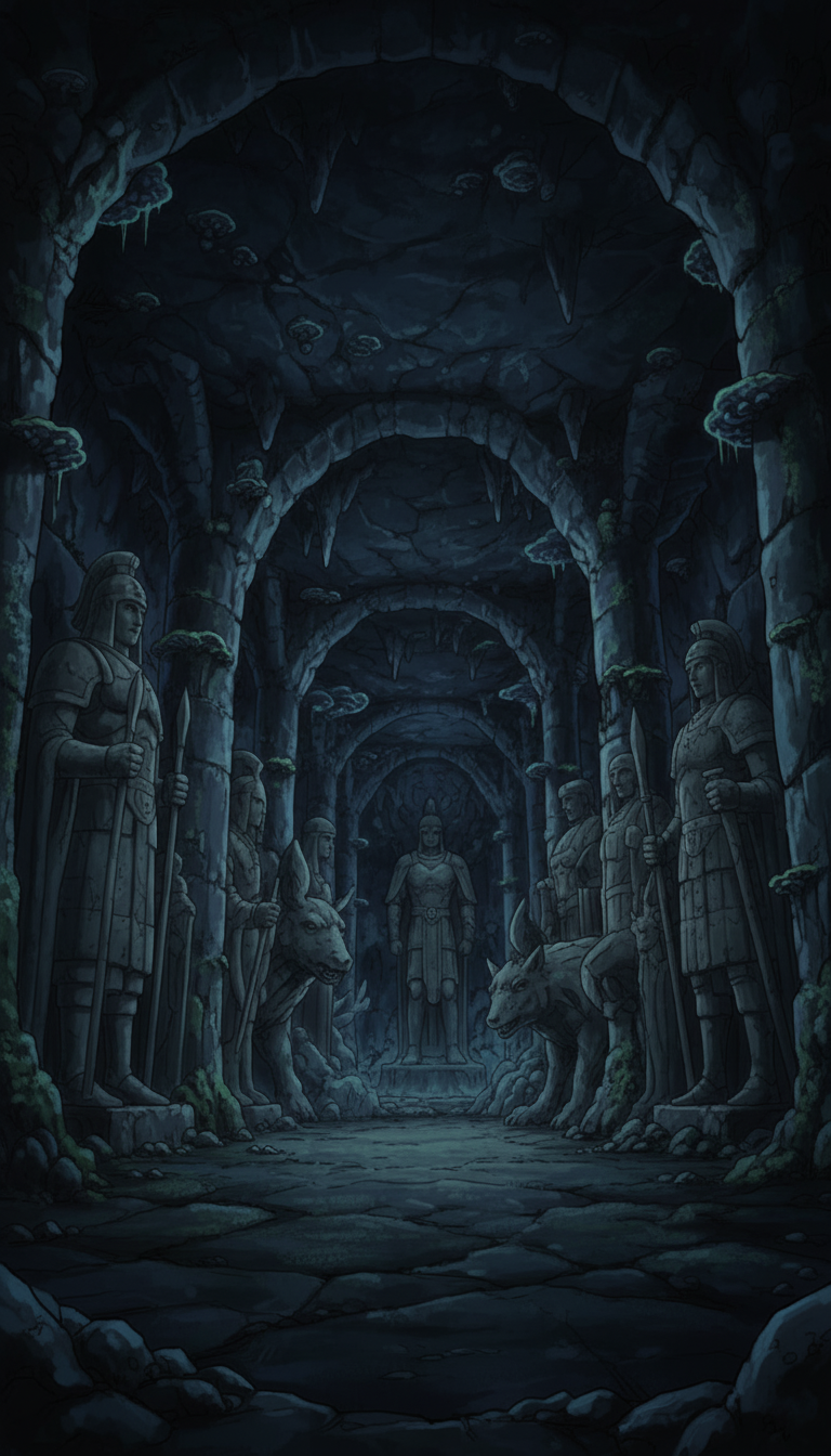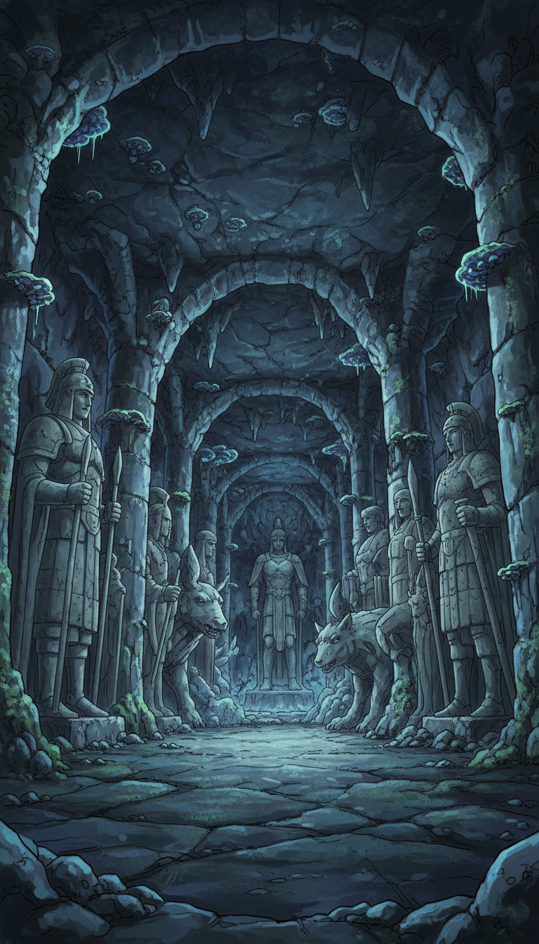 守護像の石柱回廊|古代騎士像が並ぶ地下通路背景