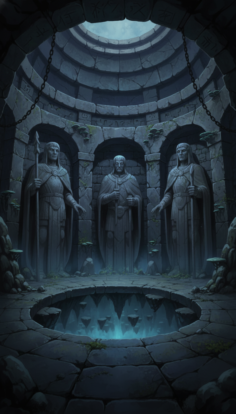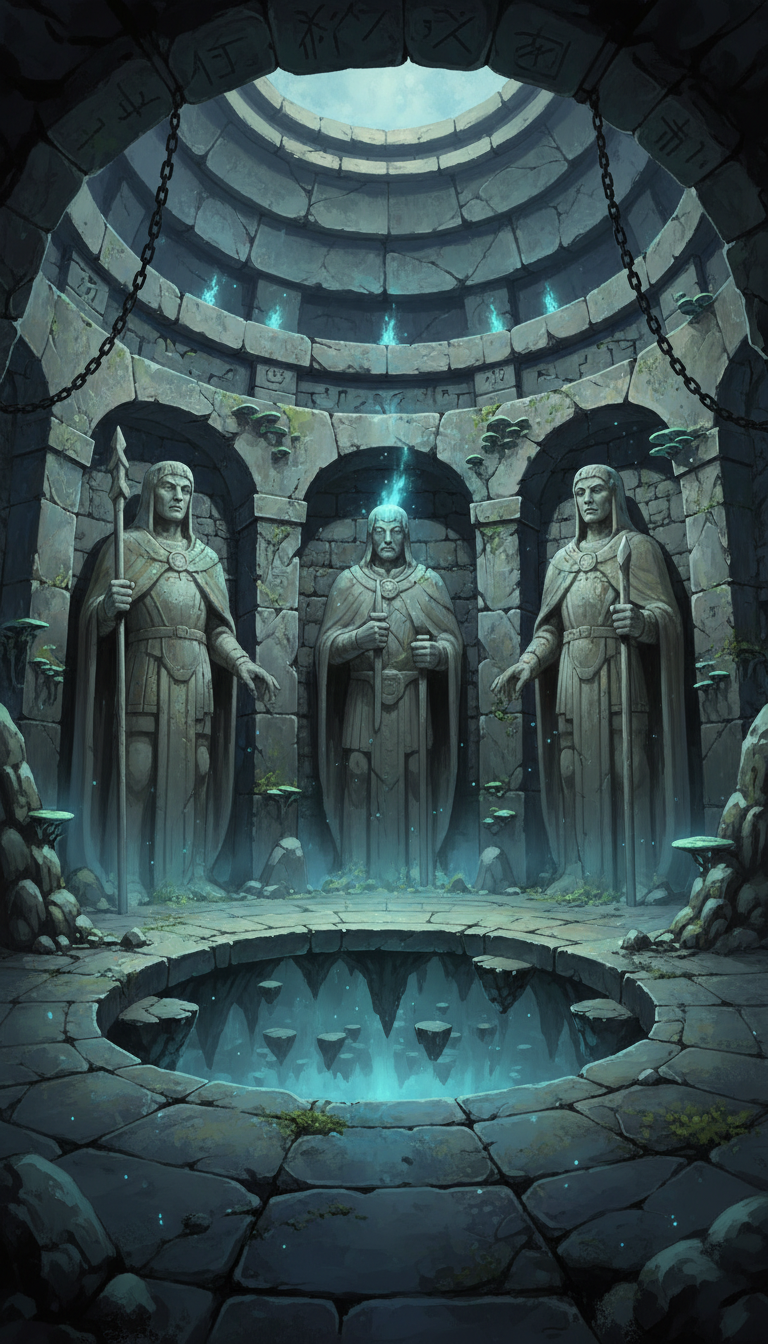 冷たい空気が漂う円形の石室が神秘性を強め、謎解きや禁域探索に合う背景です。