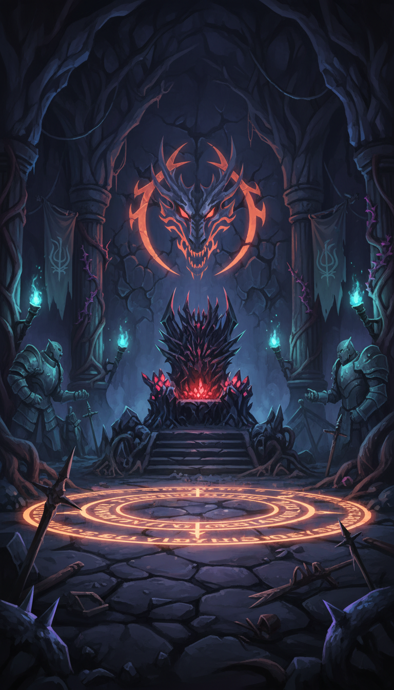 玉座と発光する魔法陣が存在感を放ち、ボス戦・謁見・最終決戦の舞台に使える背景です。