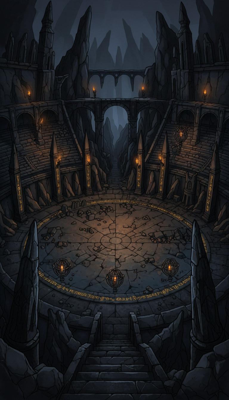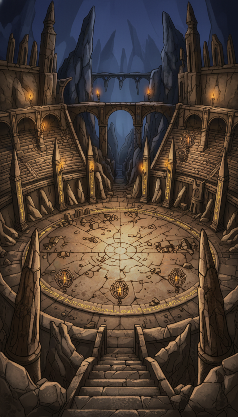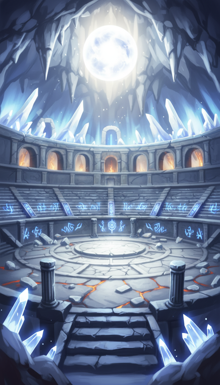 月輪の結晶闘技場|ルーン刻まれた地下円形アリーナ背景