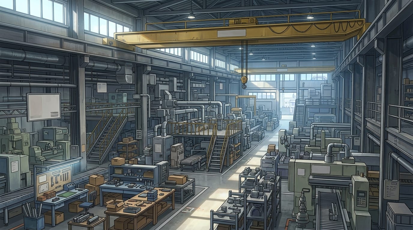 天井クレーンや配管設備が並ぶ大規模な工場内を描いた、製造現場や産業シーンに使いやすい背景イラスト素材です。