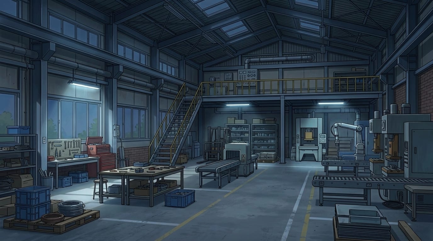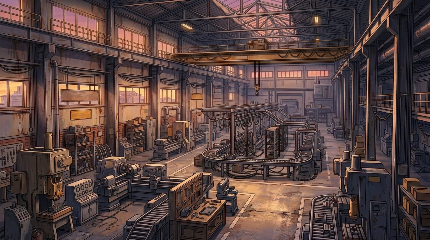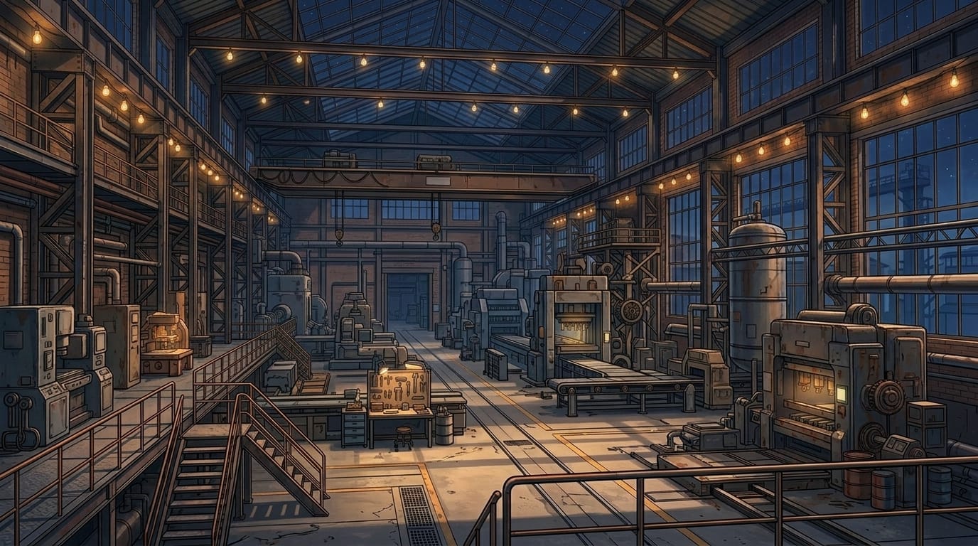夕方の光が差し込む工場内に生産設備や作業台が並ぶ、雰囲気ある背景イラスト素材です。