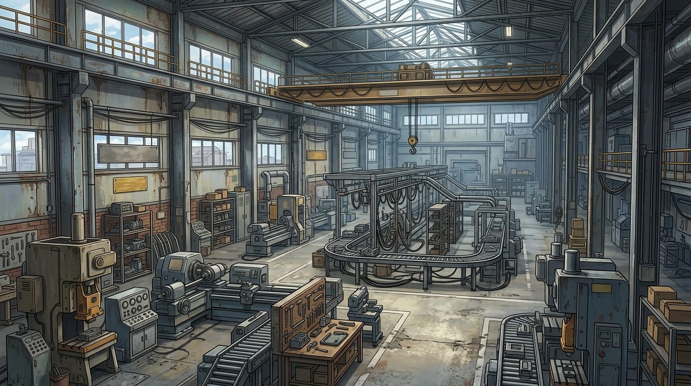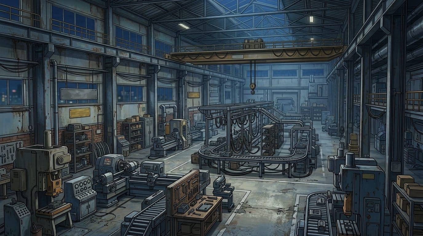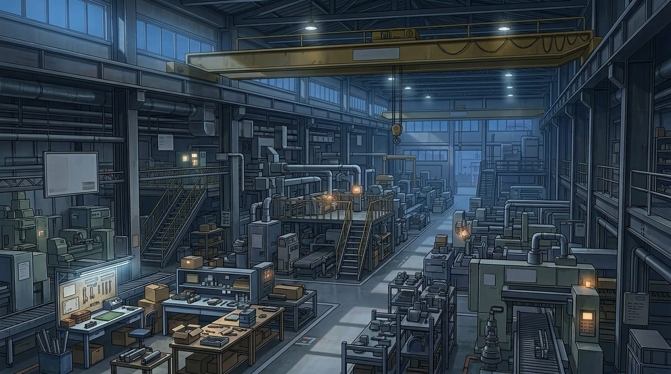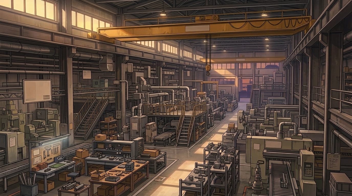 夕方の光が差し込む工場内に生産設備や作業台が並ぶ、雰囲気ある背景イラスト素材です。
