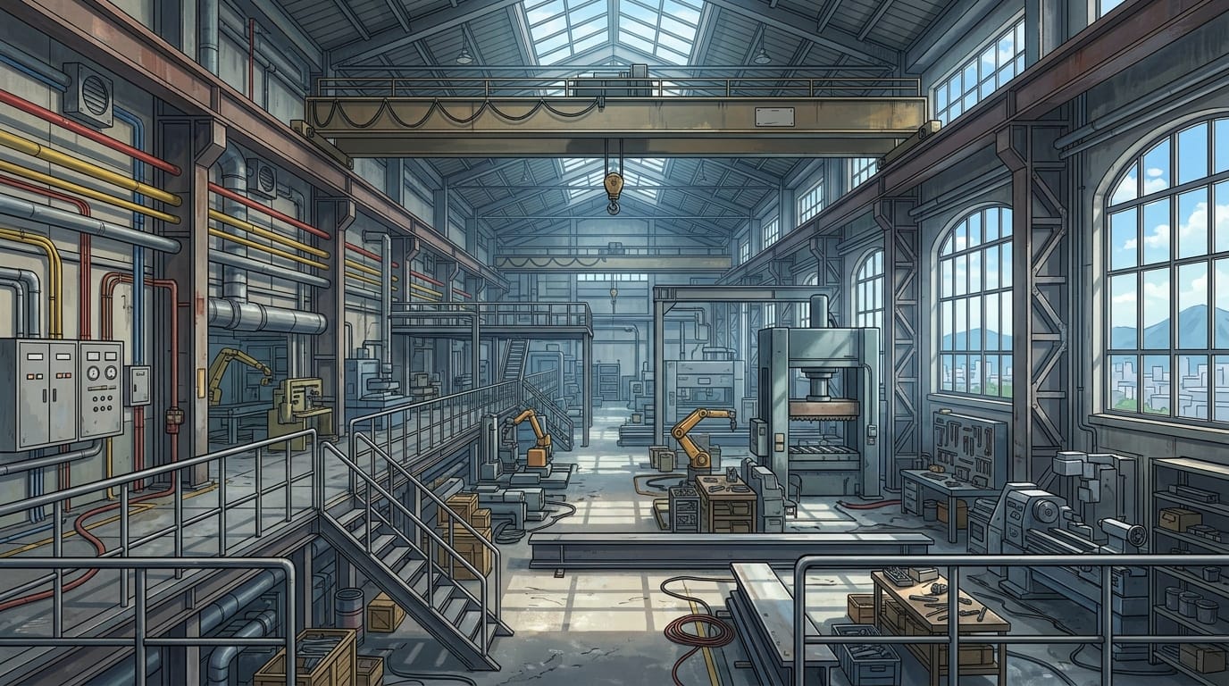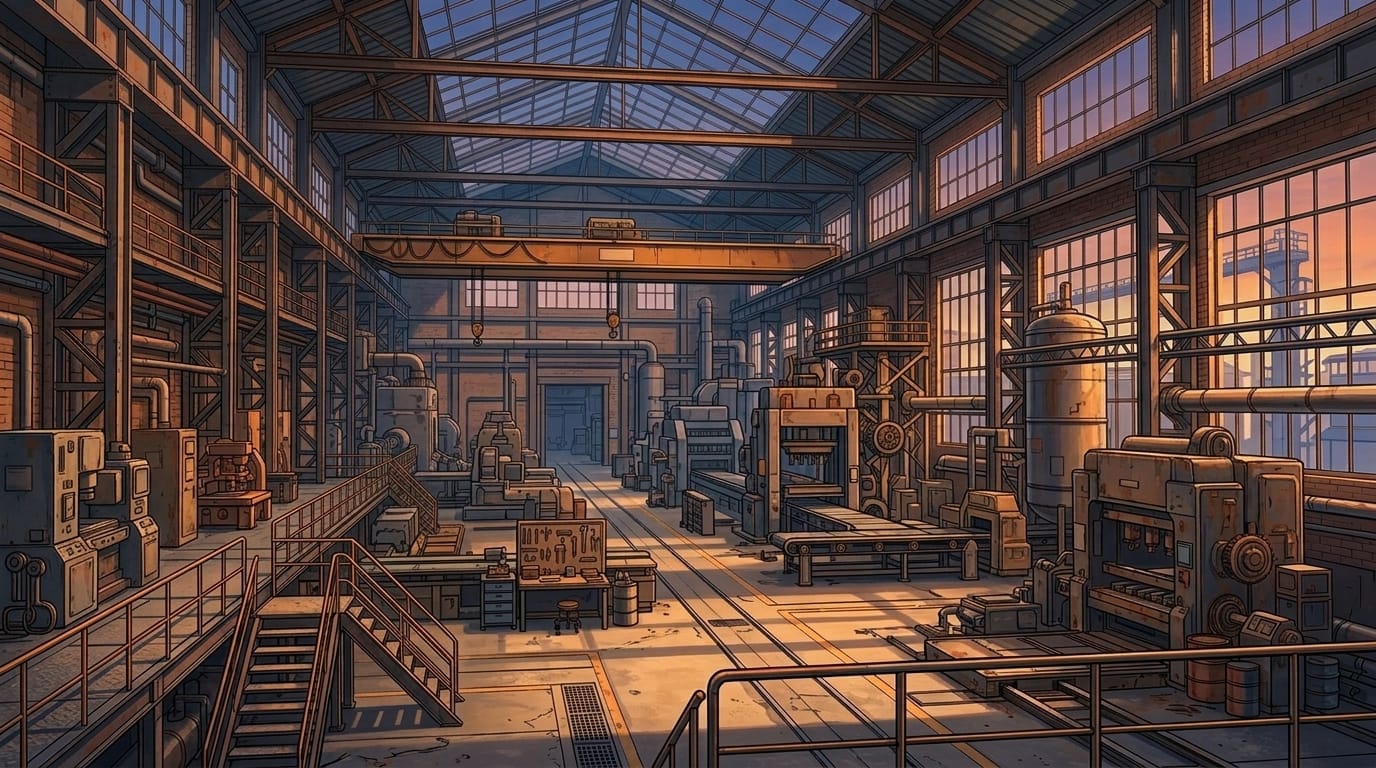 夕方の柔らかな光が差し込む工場内に産業機械が並ぶ、落ち着いた印象の背景イラスト素材です。