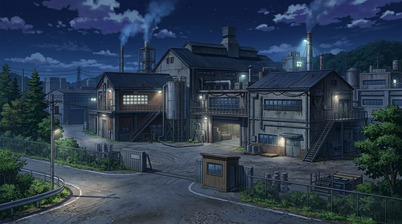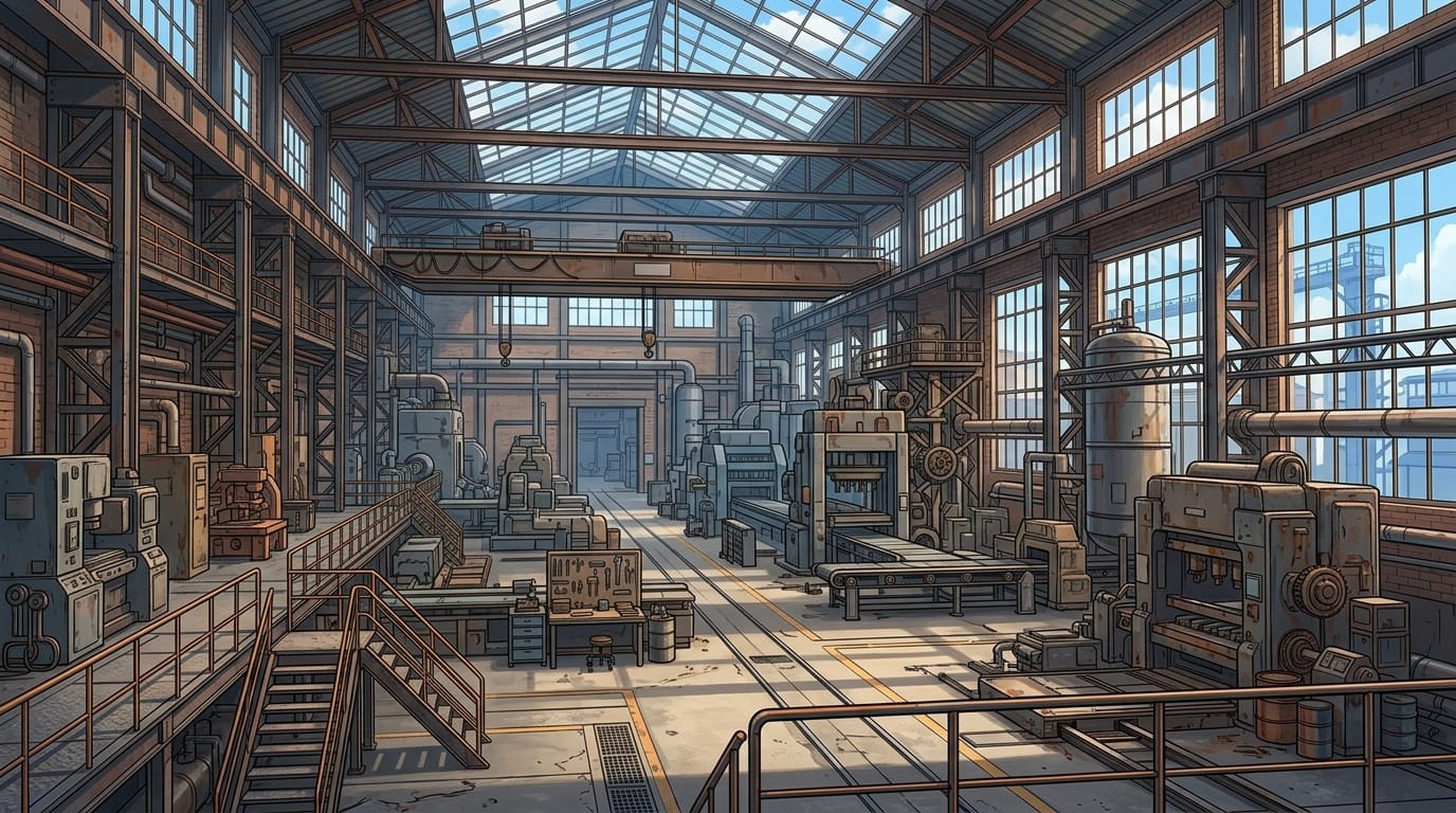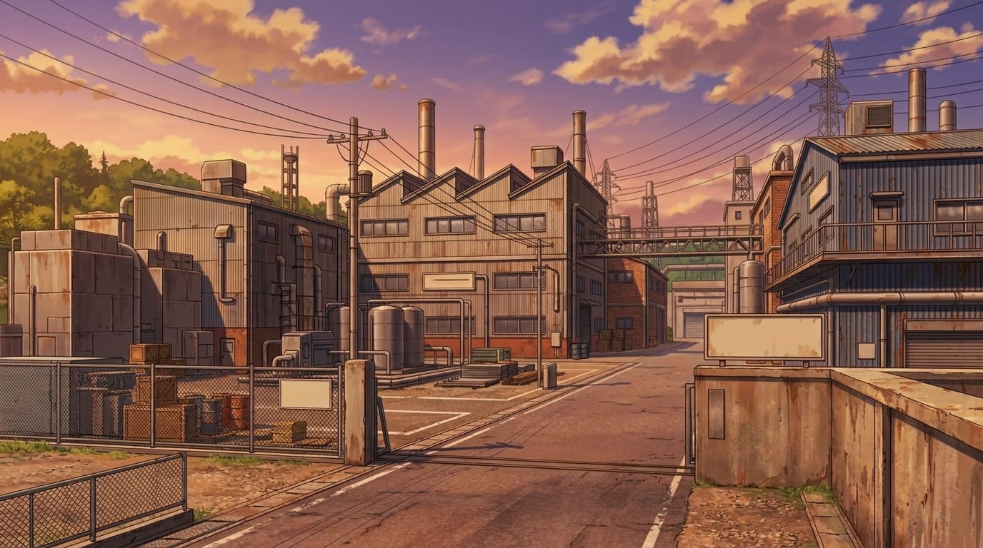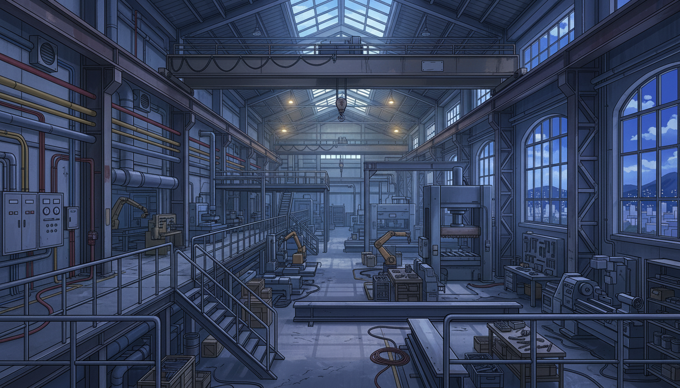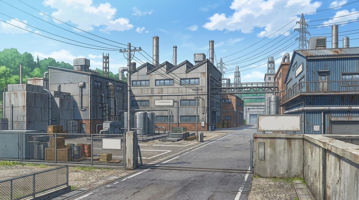 工場の背景イラスト素材を無料配布。16:9の横長構図でPC向け作品に使いやすい背景イラストです。漫画・Webtoonやゲーム背景として商用・トレース利用もOK!