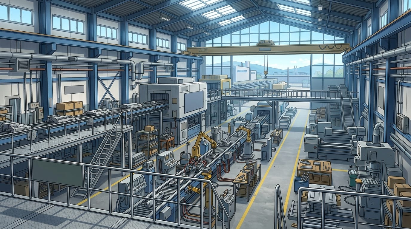 大型機械や通路が整備された広い工場空間を描いた、製造業や工業施設の背景に使いやすいイラスト素材です。