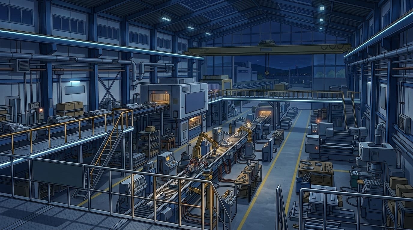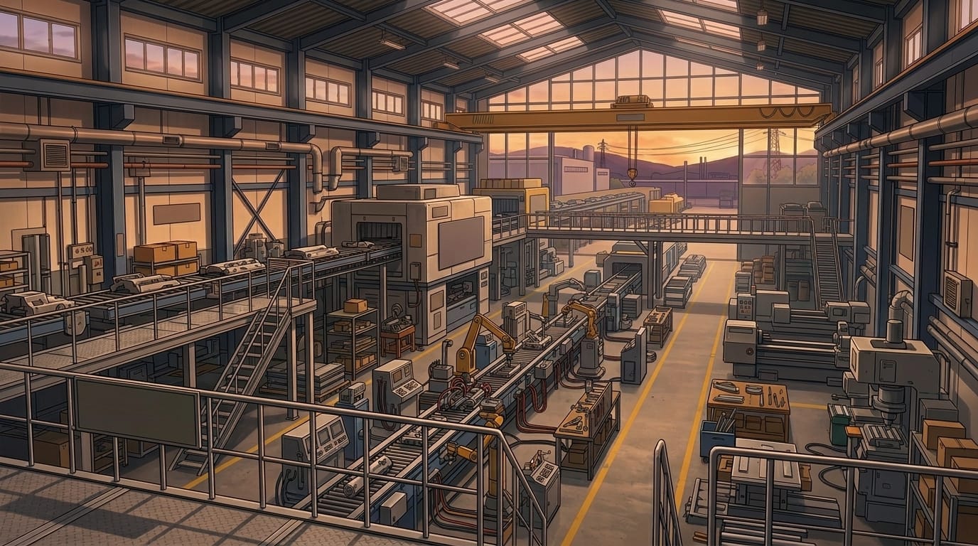 夕方の光に包まれた工場内で自動化ラインや加工設備が映える、温かみのある背景イラスト素材です。
