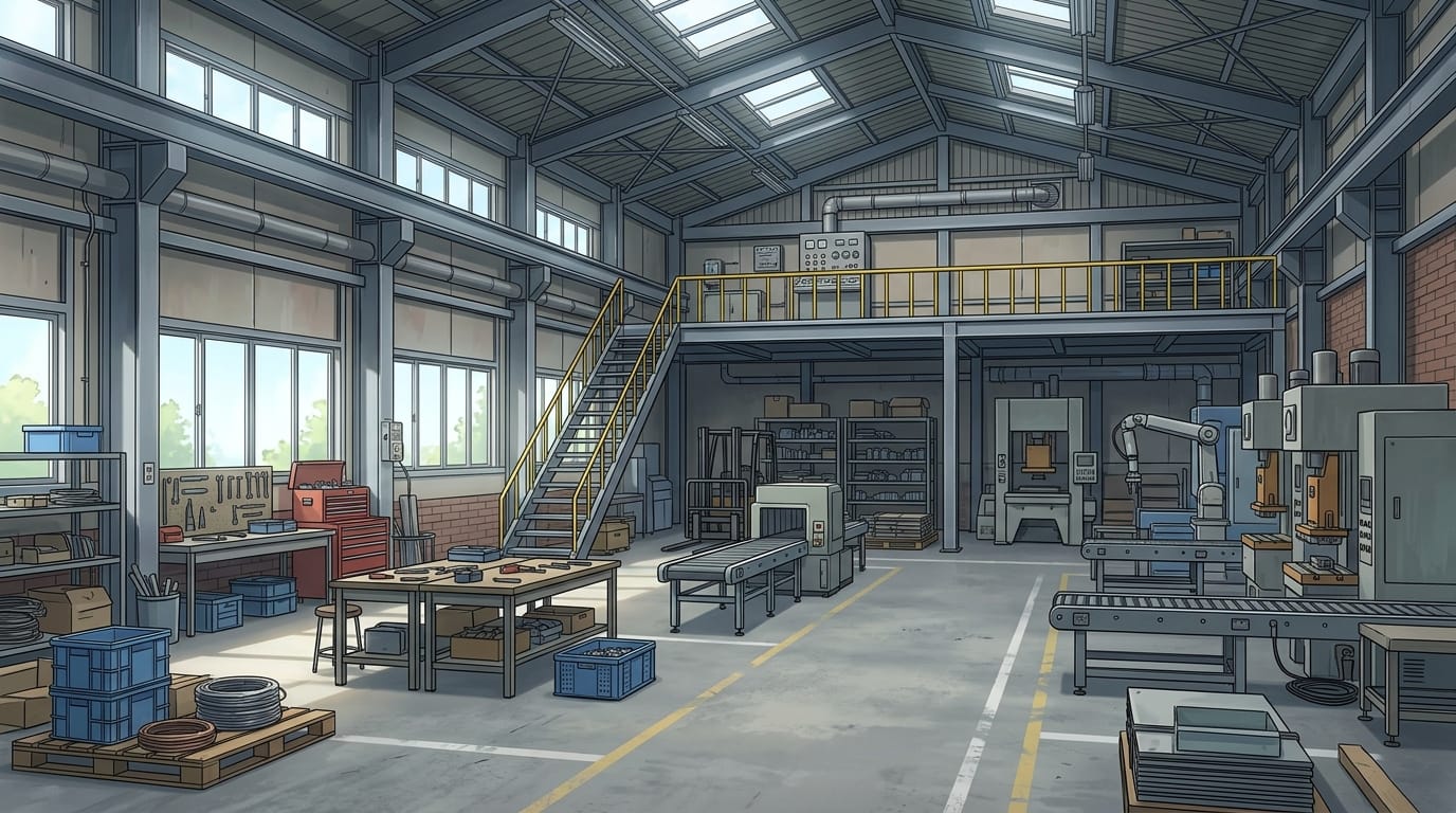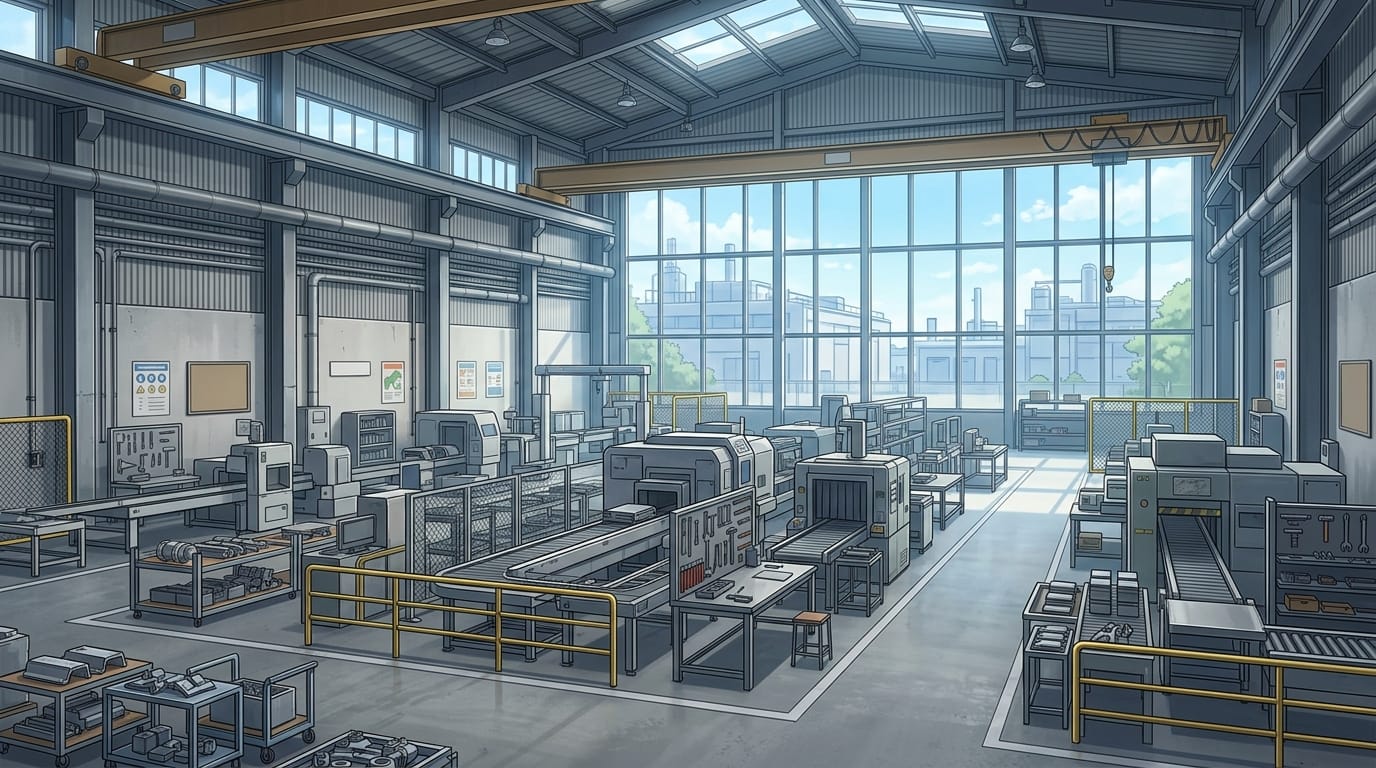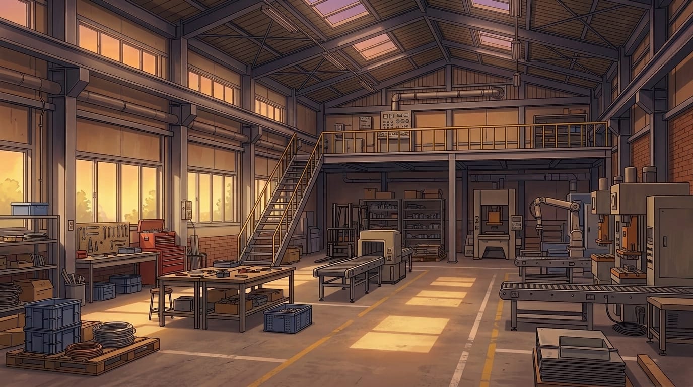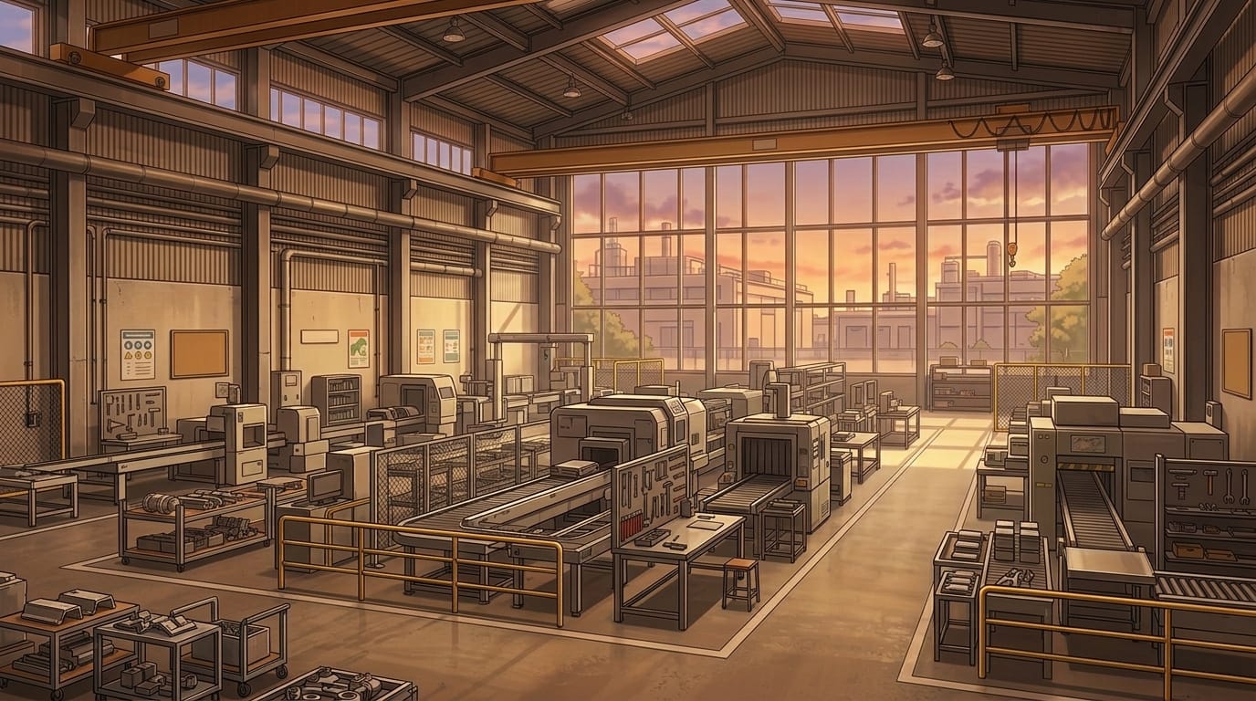 夕方のやわらかな光が差し込む工場内で作業台や加工機械が映える、実用的な背景イラスト素材です。