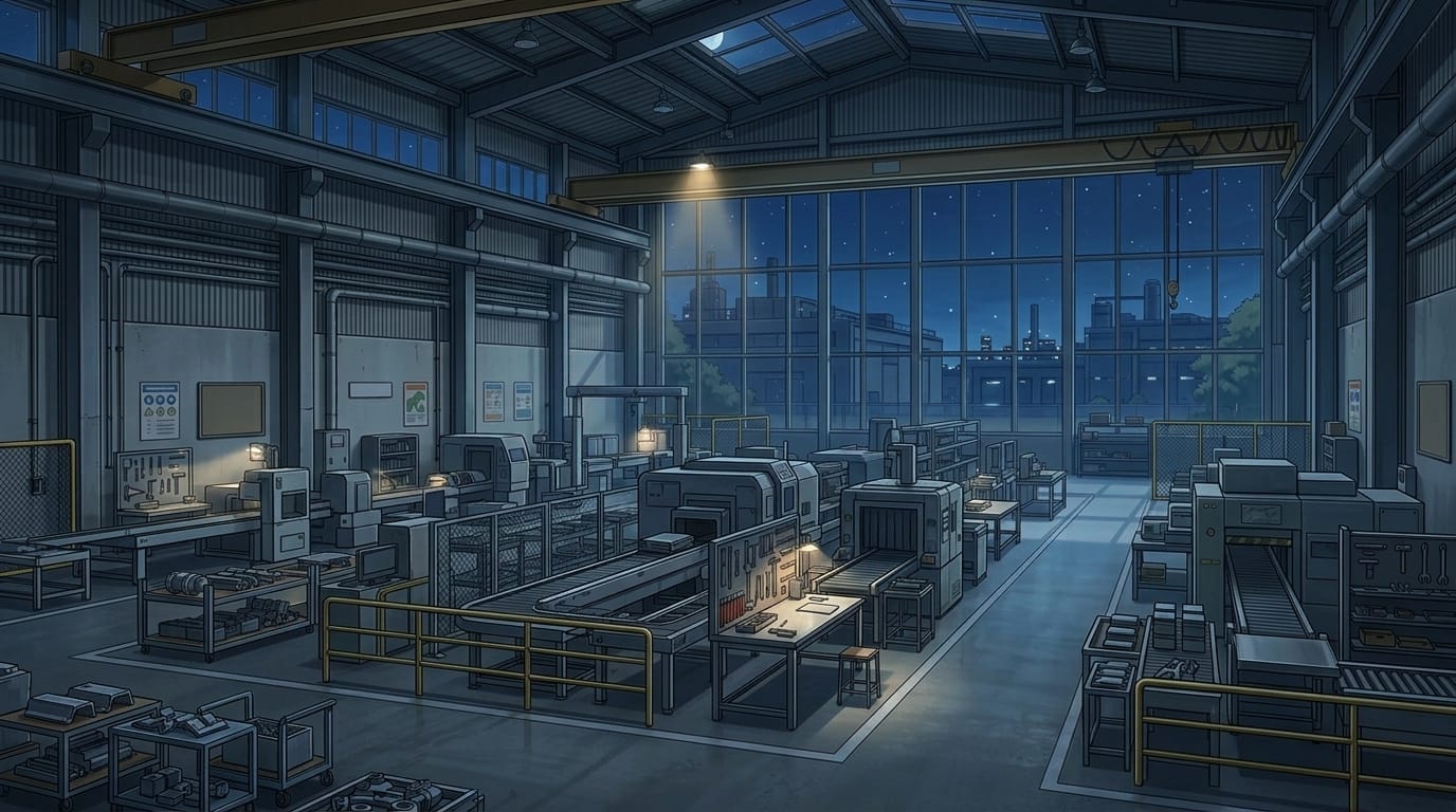 照明が灯る静かな工場内に作業台や小型機械が並ぶ、夜間の製造現場表現に使いやすい背景イラスト素材です。