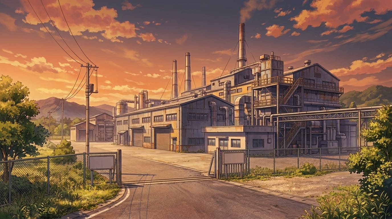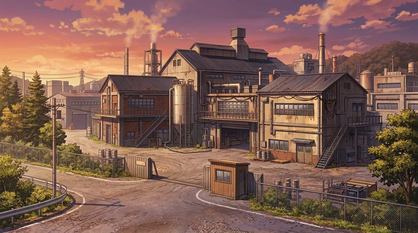 夕暮れの工場外観と敷地入口風景|背景イラスト素材