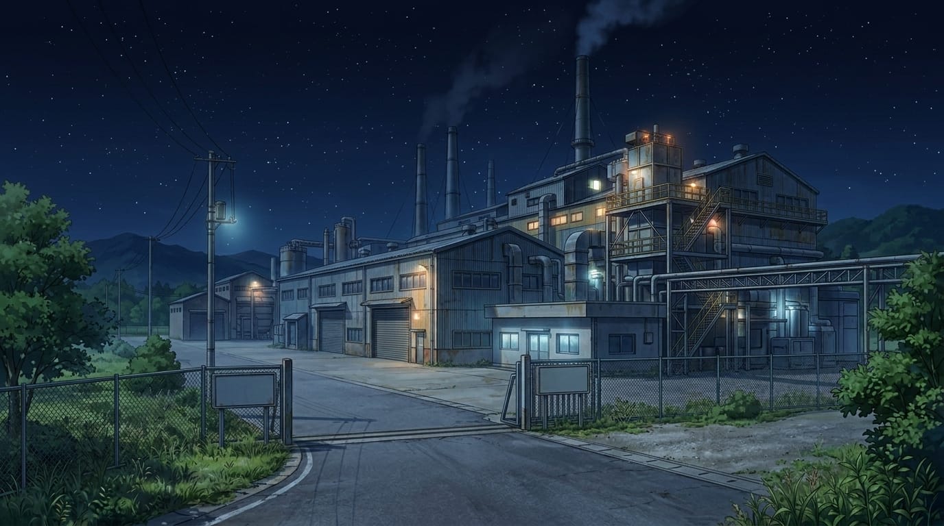 夜空の下で建屋や設備の灯りが映える工場外観を描いた、夜間の工業地帯表現に使いやすい背景イラスト素材です。