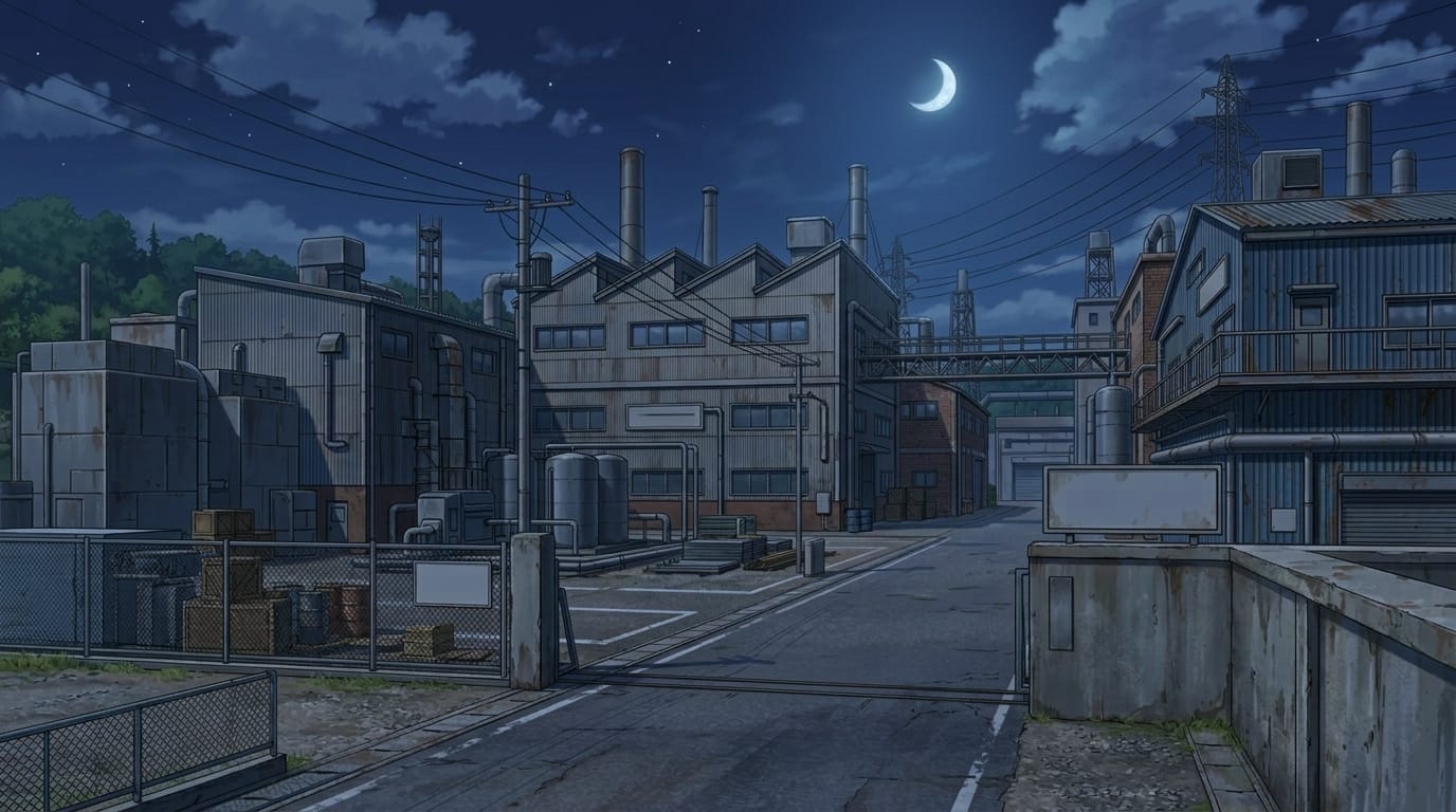 月明かりの下で静まり返った工場地帯を表現した、夜の産業シーンに使いやすい背景イラスト素材です。