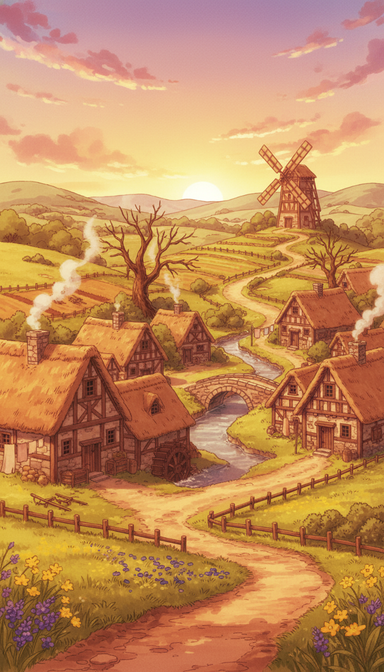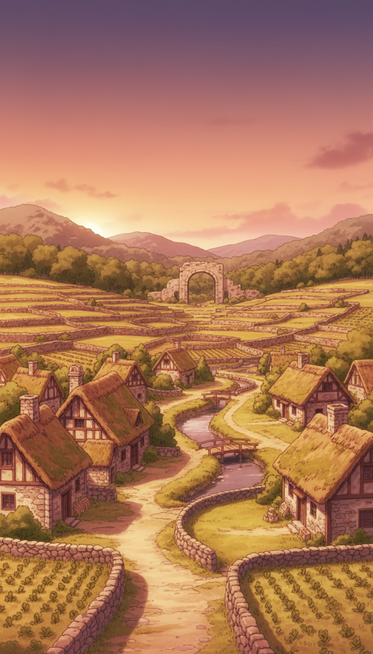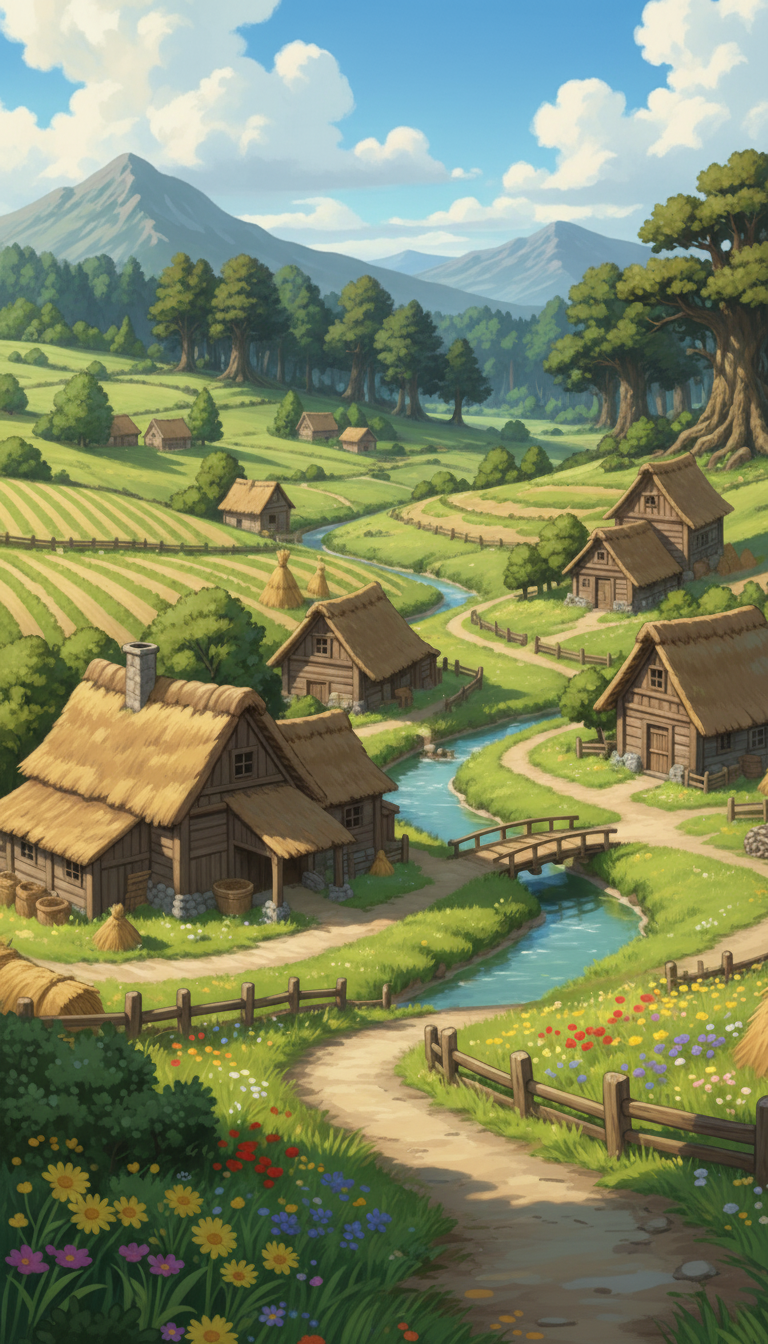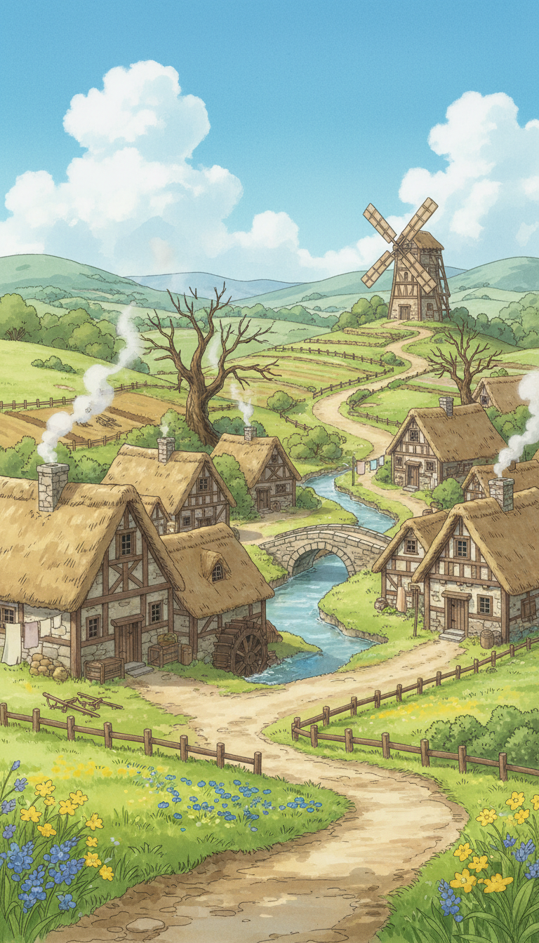 ファンタジーの農村の背景イラスト素材を無料配布。9:16の縦長構図でスマホ作品に使いやすい背景イラストです。漫画・Webtoonやゲーム背景として商用・トレース利用もOK!