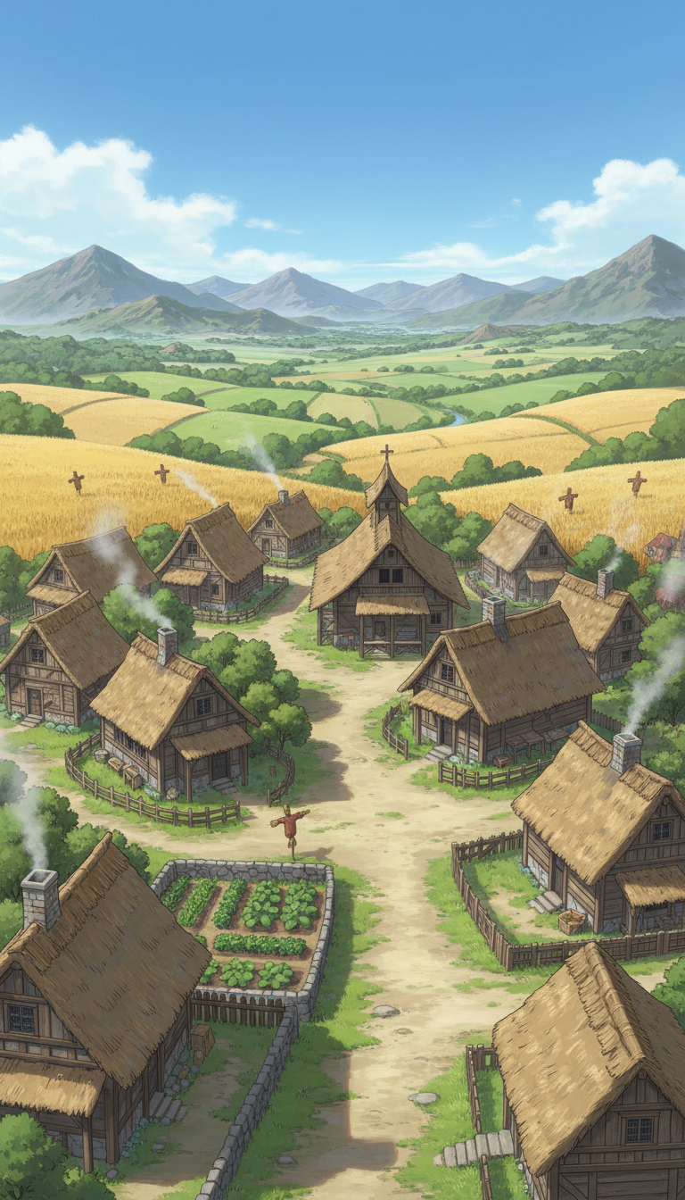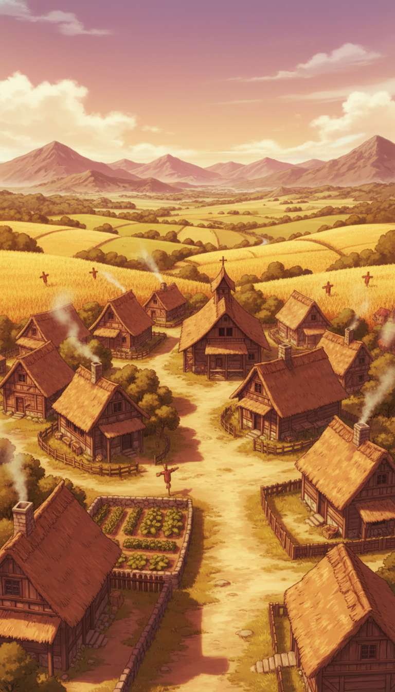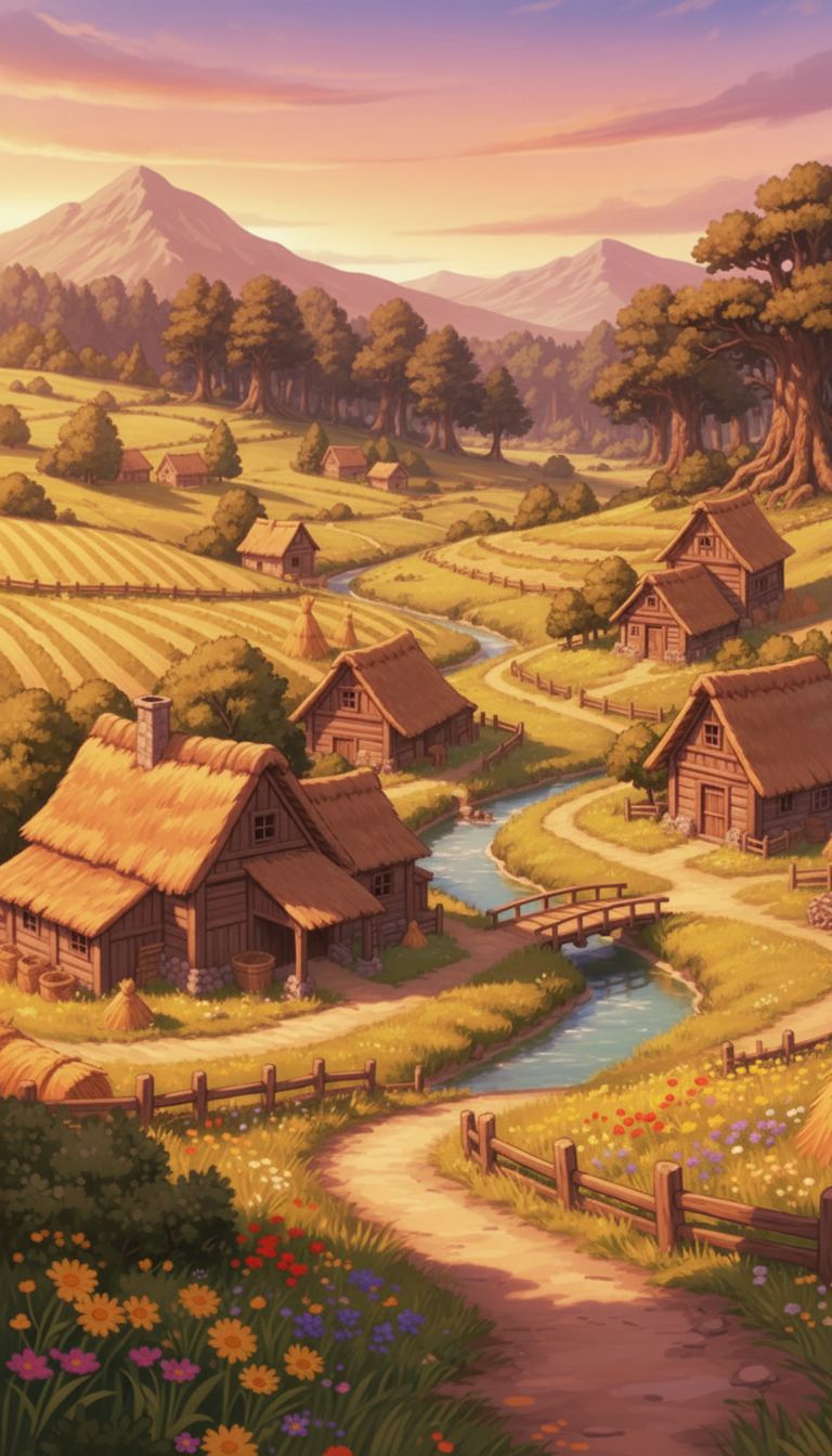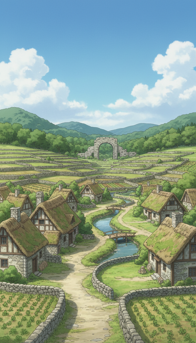 ファンタジーの農村の背景イラスト素材を無料配布。9:16の縦長構図でスマホ作品に使いやすい背景イラストです。漫画・Webtoonやゲーム背景として商用・トレース利用もOK!