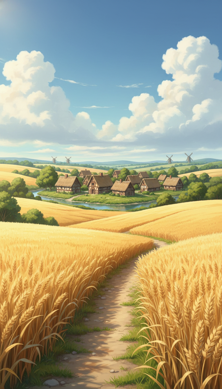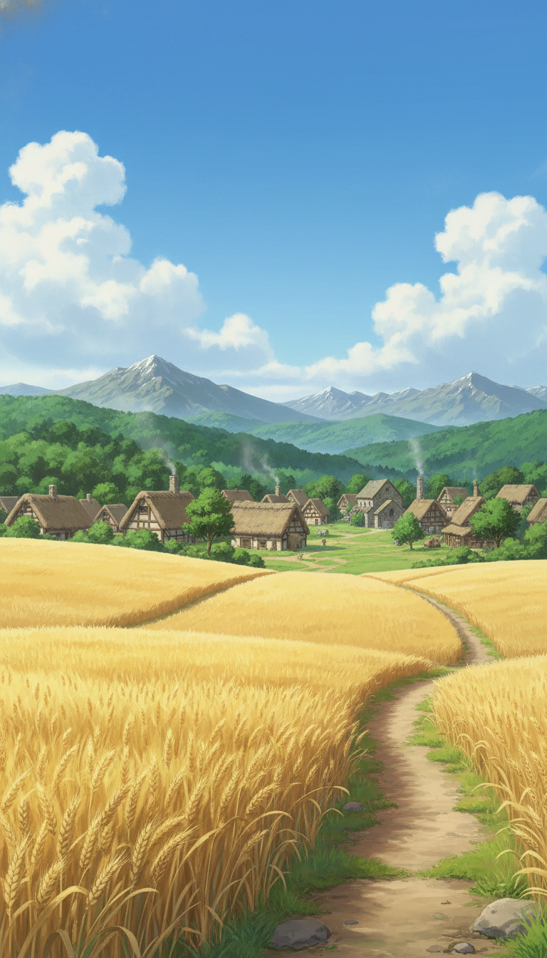 黄金の麦畑に囲まれた中世村落|収穫祭シーン向け背景